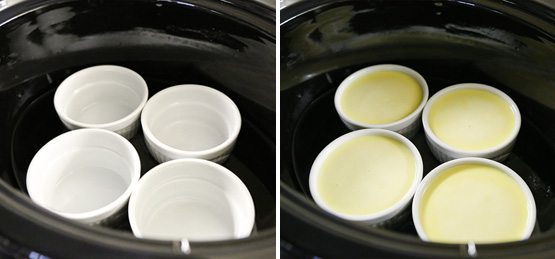 2. Place four- 6 oz ramekins in the pot of a slow cooker. Add about 1 1/2-2 cups of water until the ramekins are about 3/4 submerged in water. Distribute mixture evenly among ramekins (fill almost to the top). Cover slow cooker with lid and cook on low heat for 2-3 hours until custard is set and registers 185 degrees F on a food safe thermometer.