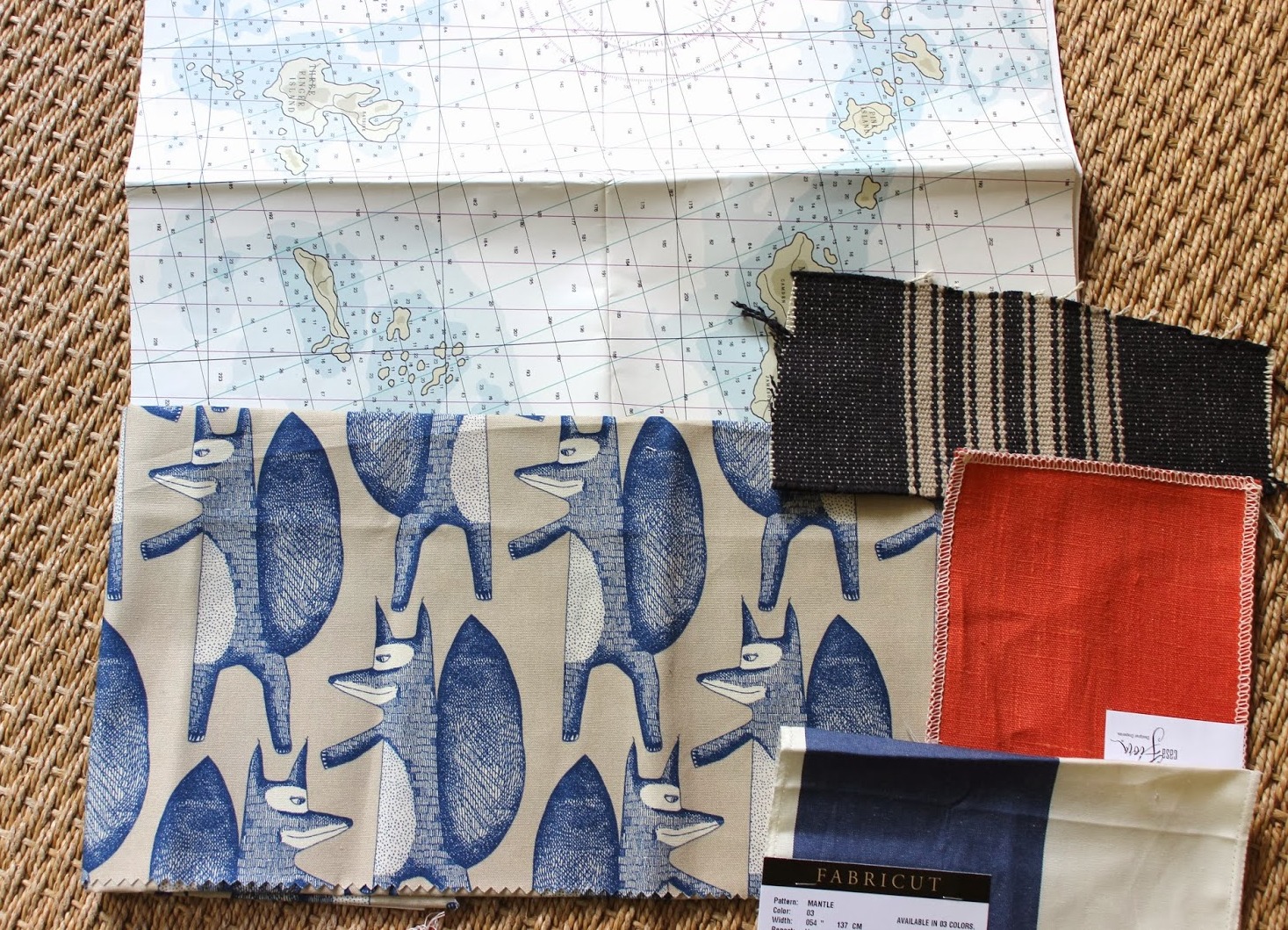 This is the same home. The map wallpaper is for the walls in a playroom. I fell in love with the fox fabric, so it will work as pillows on a brown leather sofa. Add in the black and camel stripe and the orange for pillows. Then the larger navy stripe for curtains. Again the fox fabric is my lead. Navy and orange go so well together, and of course black is a neutral like white.