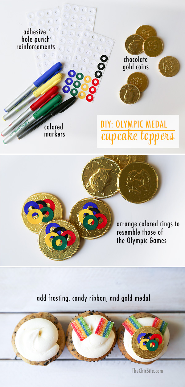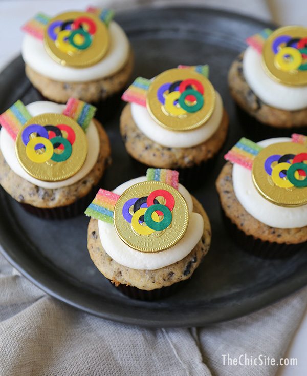 I have lots and lots of these adhesive hole punch reinforcements that I’ve racked up during my school years. Simply color the rings according to the colors of the Olympic Rings: blue, black, red, yellow, and green. Arrange them on top of a chocolate gold coin. I used these sour rainbow belts as ribbon and placed the chocolate gold coin over it. Voilà! A cute and fun cupcake topper!