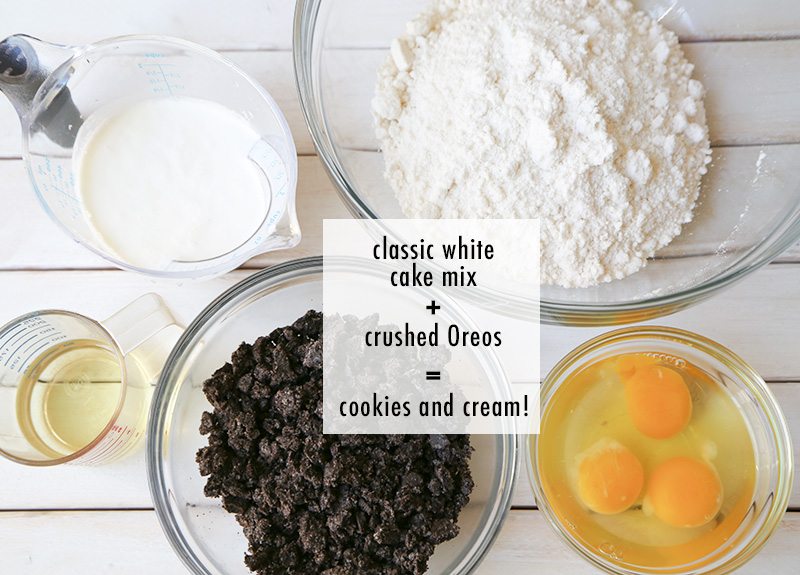 There are many ways to upgrade and personalize these mixes. I like to substitute some milk or cream in place of the water needed in the box recipe. I find that it makes the cake richer, fluffier and more flavorful. You can also add all sorts of toppings and mix-ins. I used crushed Oreos to make these cookies and cream cupcakes!