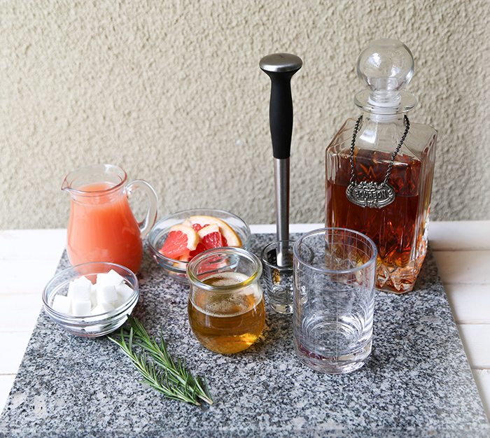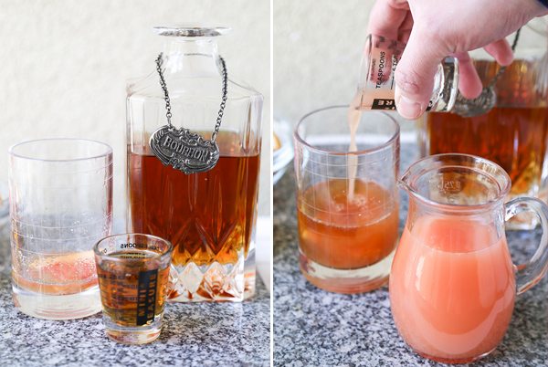 Add 2 ounces (2 shots) of your bourbon of choice. Follow with 3 oz of grapefruit juice. (I used unsweetened, fresh grapefruit juice.)