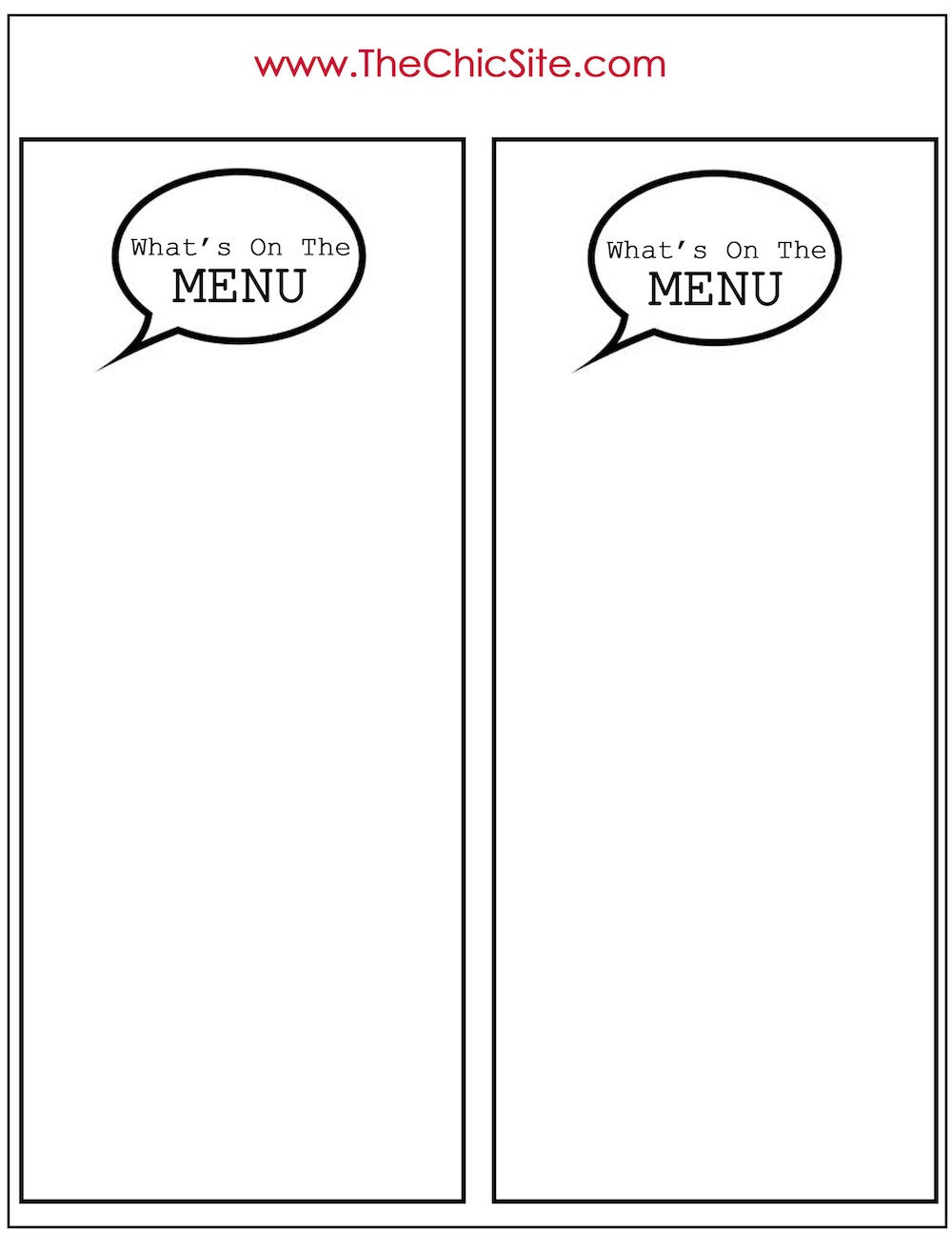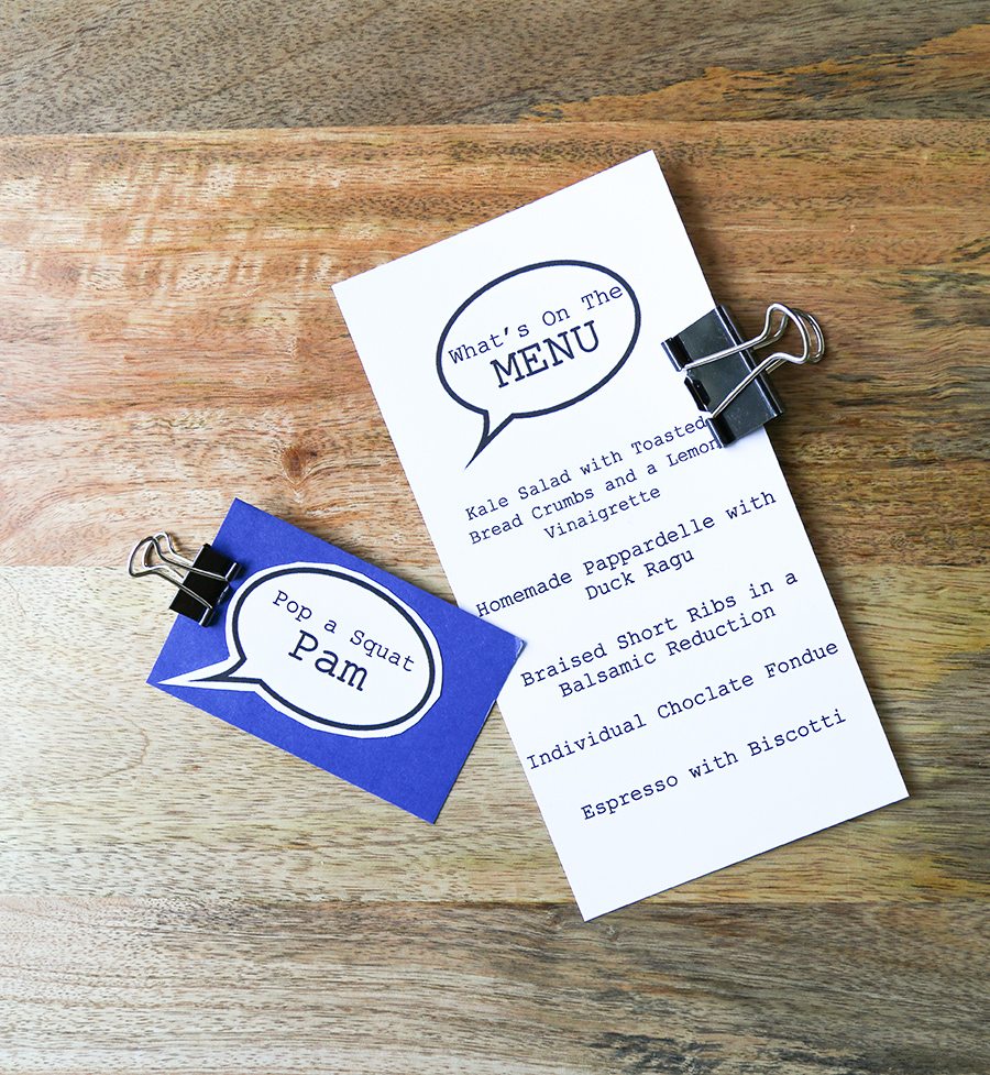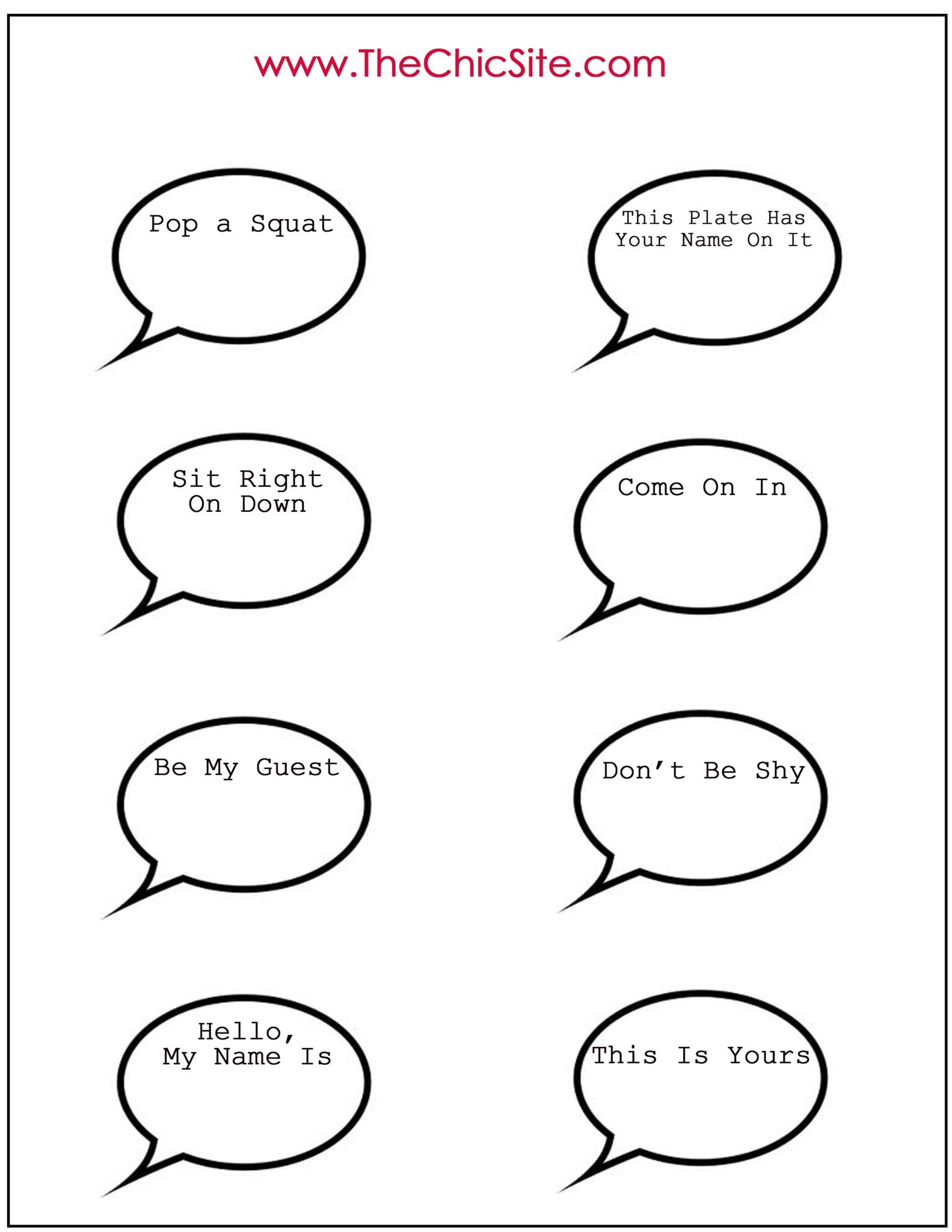 Just save this image (above and below) to your computer. Then you can use a fine tipped black pen to write in your menu and your guest names… or, go the extra mile and format a word doc to print it for you. Use a pair of sharp scissors to cut out the shape of the talk bubbles and attach them to a solid color card stock (preferably one that matches your table linens) like my photo.