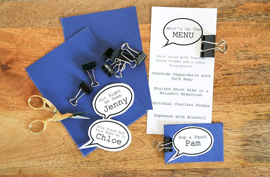 As a lifelong event planner I have a special place in my heart for for unique place settings. It’s such a simple way to add a little flair to a dinner party (or even just a Sunday supper with your family). Since a DIY setting is easiest if you can use items you have laying around the house, or in this case the office ,I dreamed up a cheeky little idea using binder clips and FREE printable that you can download and use for your next party!