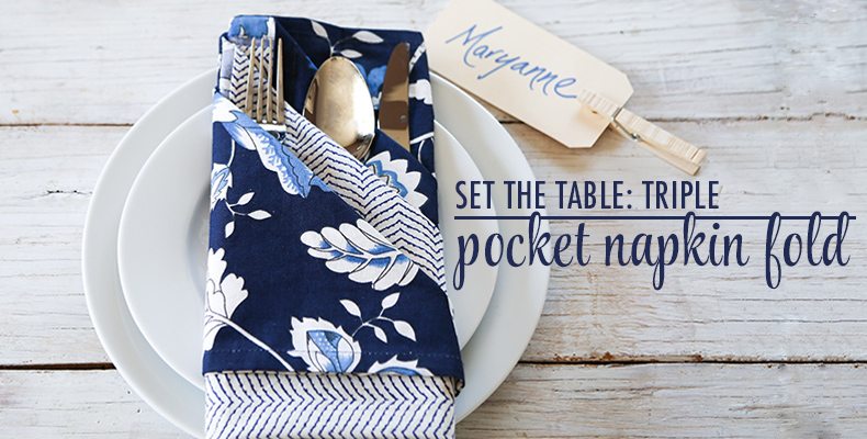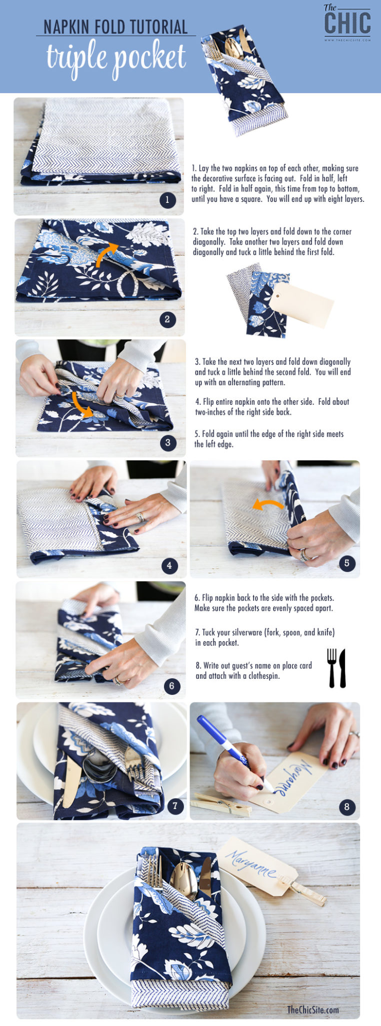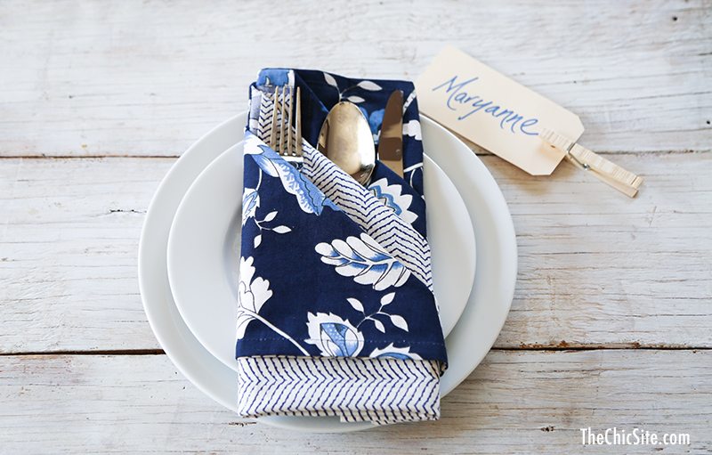 A ton of people on Pinterest have shown you a triple pocket napkin, but I thought it’d be fun to upgrade it by using two complimentary prints. I used Aquarius Blue Blooms and Chevron Blue napkins from Pier One.
