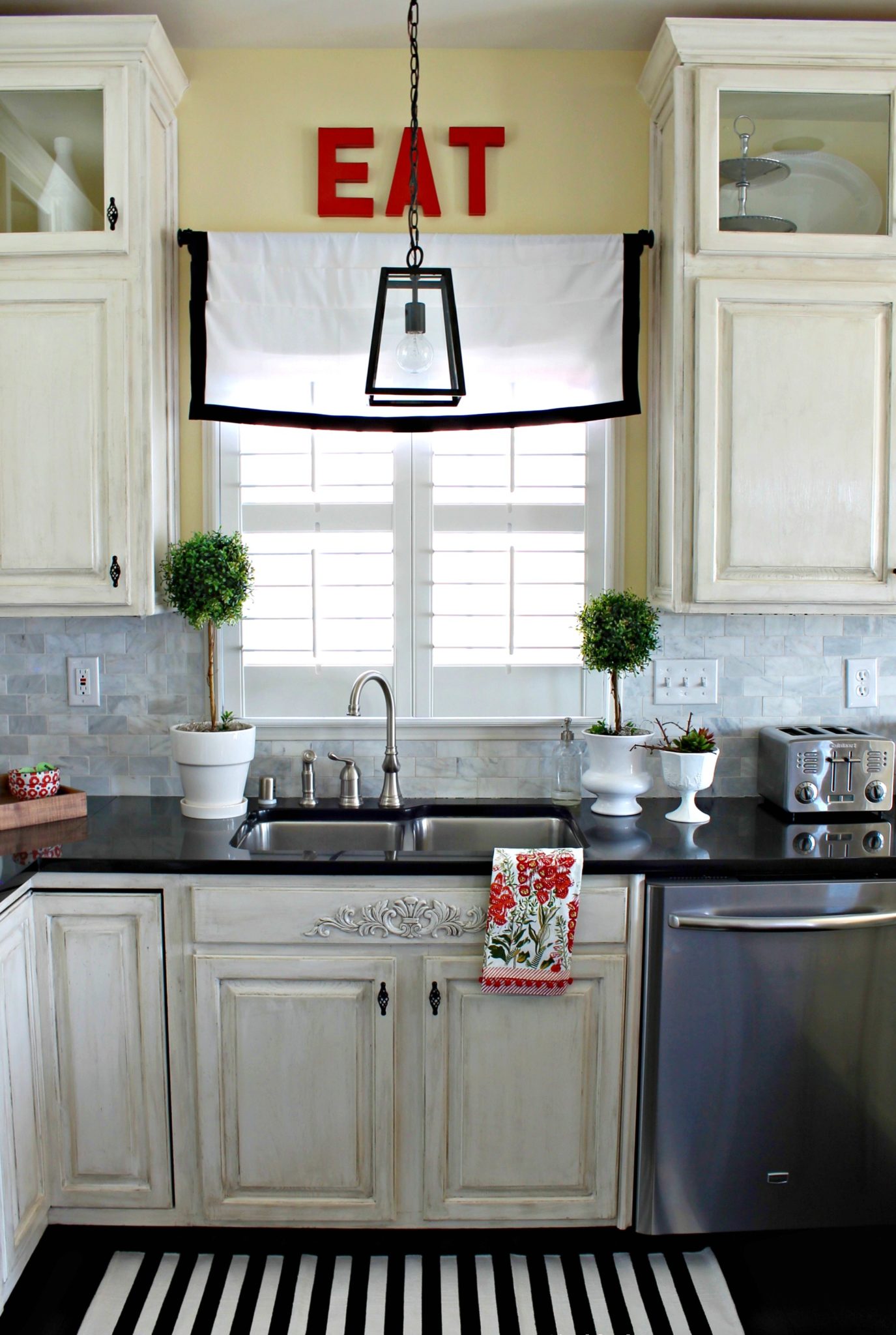 While our kitchen, with it’s traditional combination of distressed white cabinets, black granite countertops and marble subway tile backsplash, is definitely more my speed.