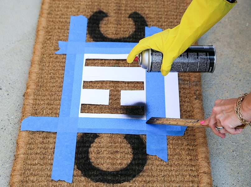 Next measure the length of your doormat. Make sure your first and last letter are the same distance from the edge of the mat on either side. Start with the first letter, use painters tape to hold it in place. Put on your fancy rubber glove and use your ruler or stick to hold down the edge of the template where you’re spraying. Spray straight down on the outline in small bursts, you don’t need a lot of spray paint so don’t go crazy or your paint could seep under the template and mess up the line of your letters.