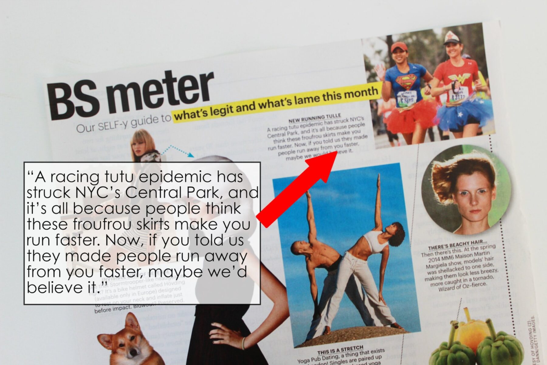 You see, Monika, was wearing the Wonder Woman costume because this was the first race she ran after being diagnosed with Brain Cancer. To add insult to injury, she makes the tutus herself and has used the proceeds to donate over $5,000 to non-profits that promote confidence building in young girls. Self put the photo of Monika in a section called “The BS meter” where the magazine tells us what is “Legit and Lame this Month.”