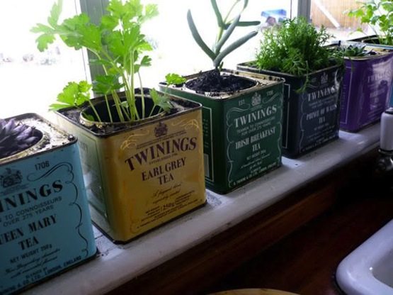 If you like to match and have a windowsill in your kitchen, choose a color to coordinate and display the herbs in a row like Better Homes and Gardens.