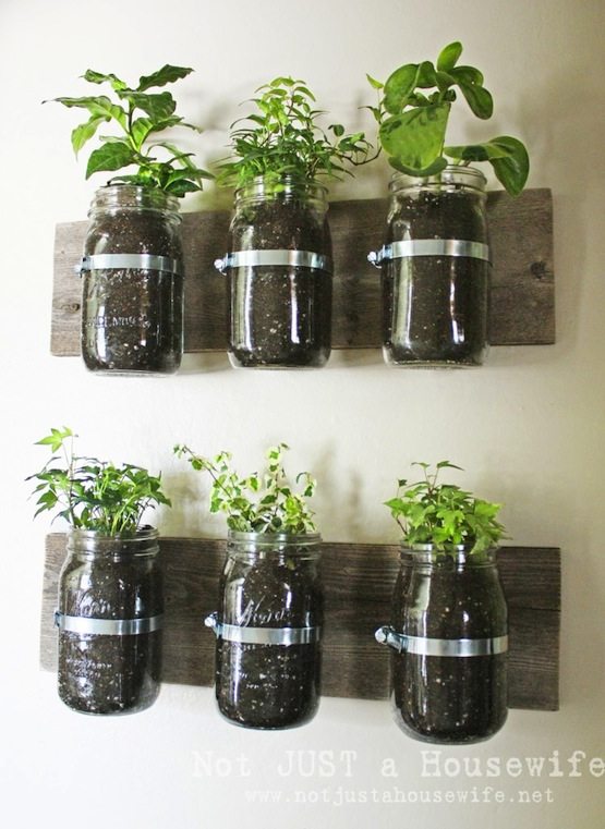 Metal, wood and mason jars. Stacy from Not Just A Housewife used all my favorite elements to neatly display her herb garden in a hallway.