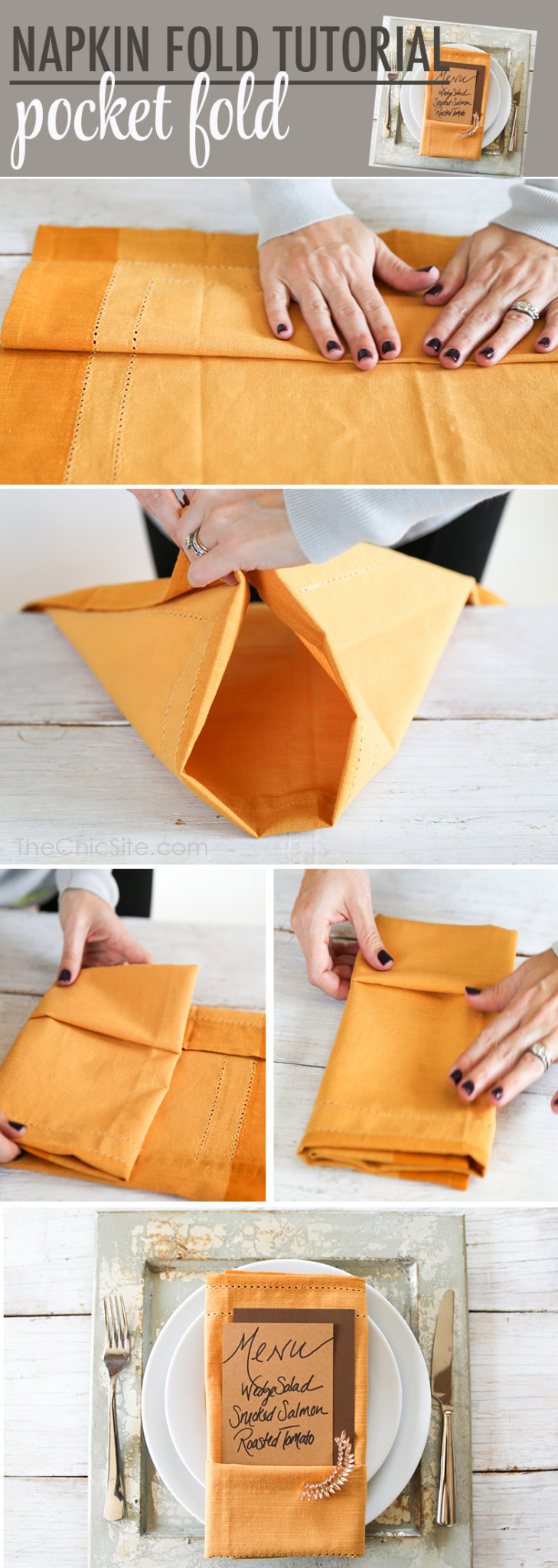 The pocket fold napkin is my go-to for dinner party place settings, and something I used for years and years when I was a wedding planner. I just love that you can tuck something in: a menu, a place card, a flower, or even a party favor… the options are endless! For those of you who are wondering how to fold one I hope you like this inspiration! ~Rachel