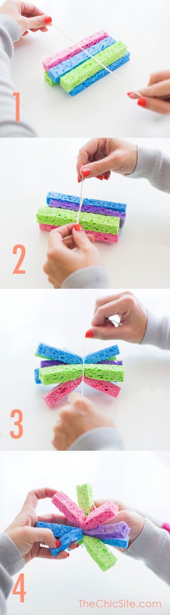 Use a marker and some rulers to cut your sponge into 1″ strips like the photo above. Now you’re basically going to make a pom pom like you did in 6th grade.