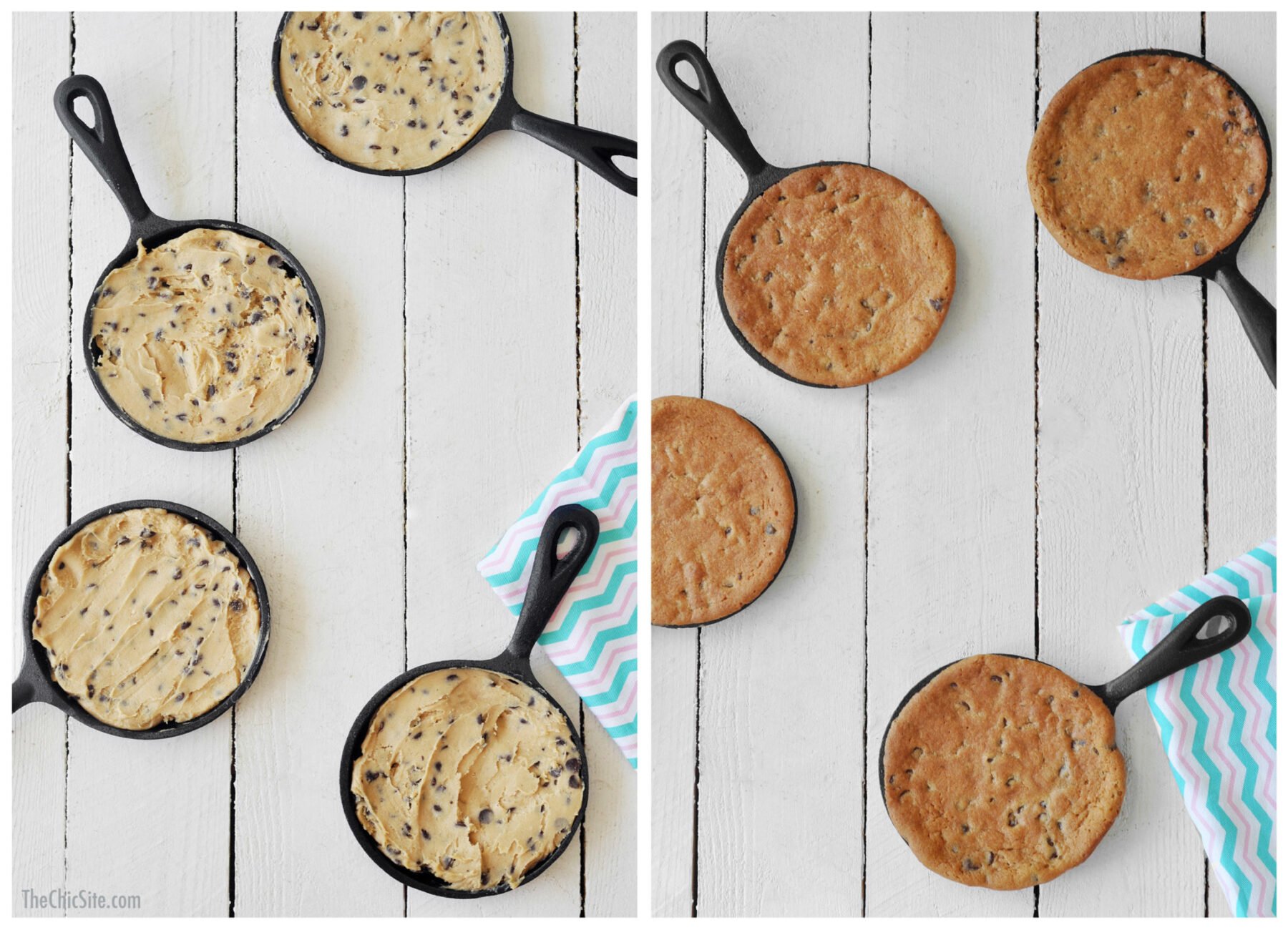 - Portion out the cookie dough among the four skillets and spread evenly with a knife or spatula. Bake for about 8 to 10 minutes or until golden brown and still somewhat soft in the center.