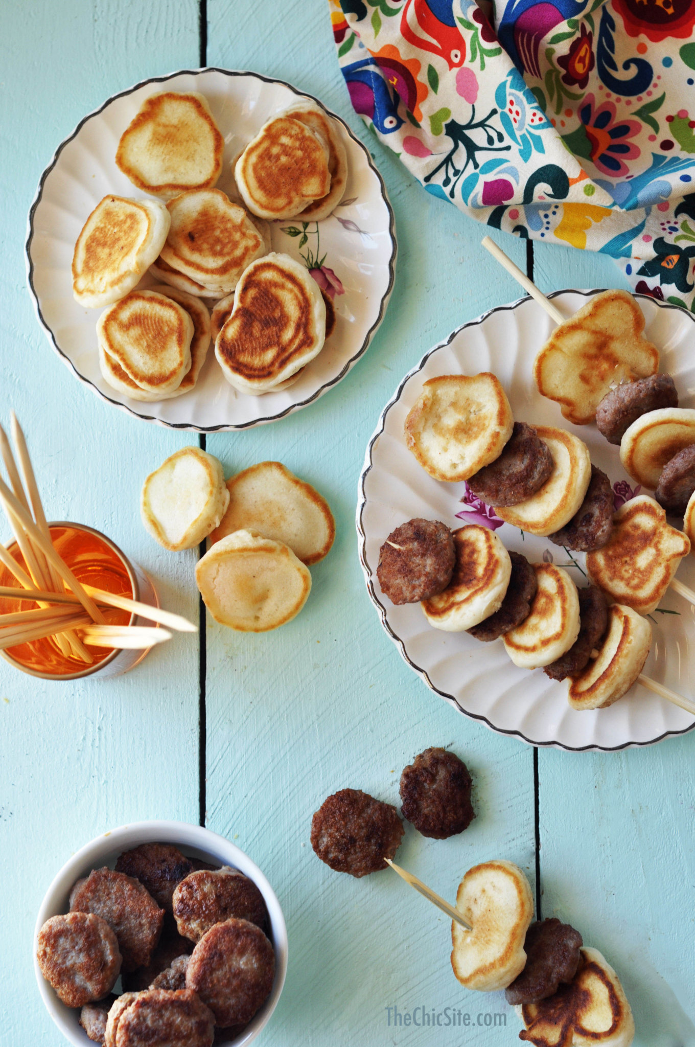 Skewer the bite sized pancakes and sausage patties, alternating between the two. Serve it alongside a bowl of maple syrup for dunking.