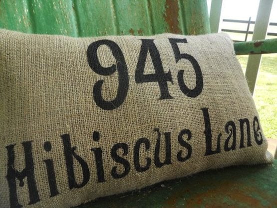 I love this idea from TakeFlyteFarm using a pillow to display house numbers on the porch.