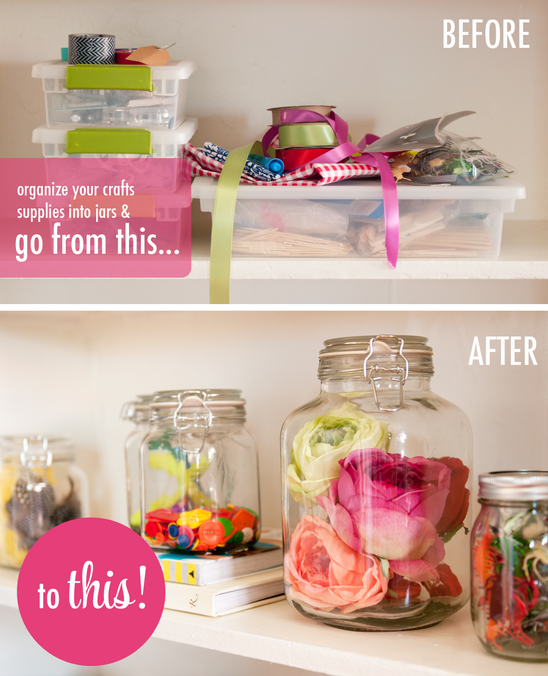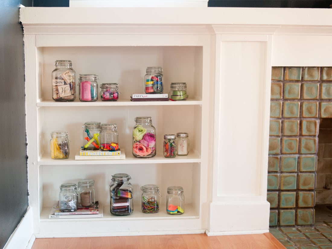 Sort your supplies by color or object and separate them into glass jars at varying heights. Take them OUT of their packaging… if you’re going to store them in in glass inside plastic you may as well just keep them in the closet.