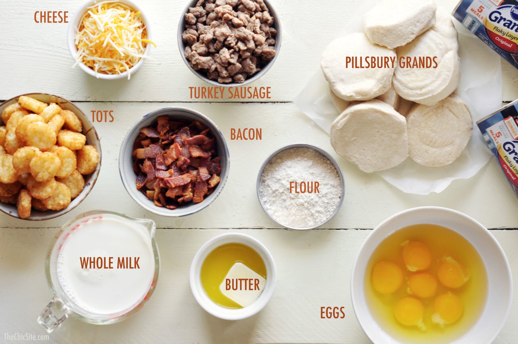 We’re going to begin by scrambling the eggs with a splash of milk, salt and pepper. Then cook them in a skillet with a bit of butter, until they’re cooked through. Add the bacon and cooked tater tots (heated in the oven until crispy). Stir to evenly combine.