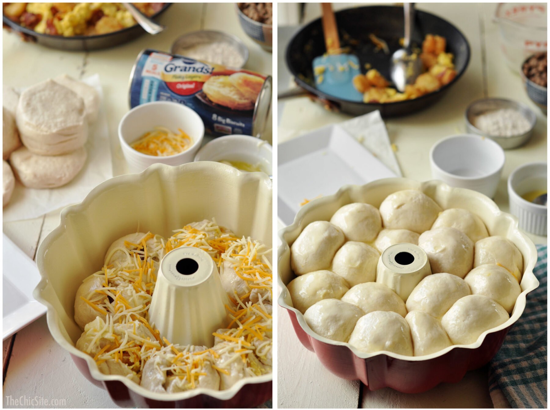 Let the mixture cool and then pop open some a can of biscuits. Cut each biscuit in half and then flatten a half to fill with the good stuff. Fill each piece with some of the breakfast filling, sprinkling a bit of cheese on top, and then roll the dough it into a ball. Place the filled dough into a greased bundt or tube pan. Brush the dough layers with melted butter and sprinkle with more cheese.
