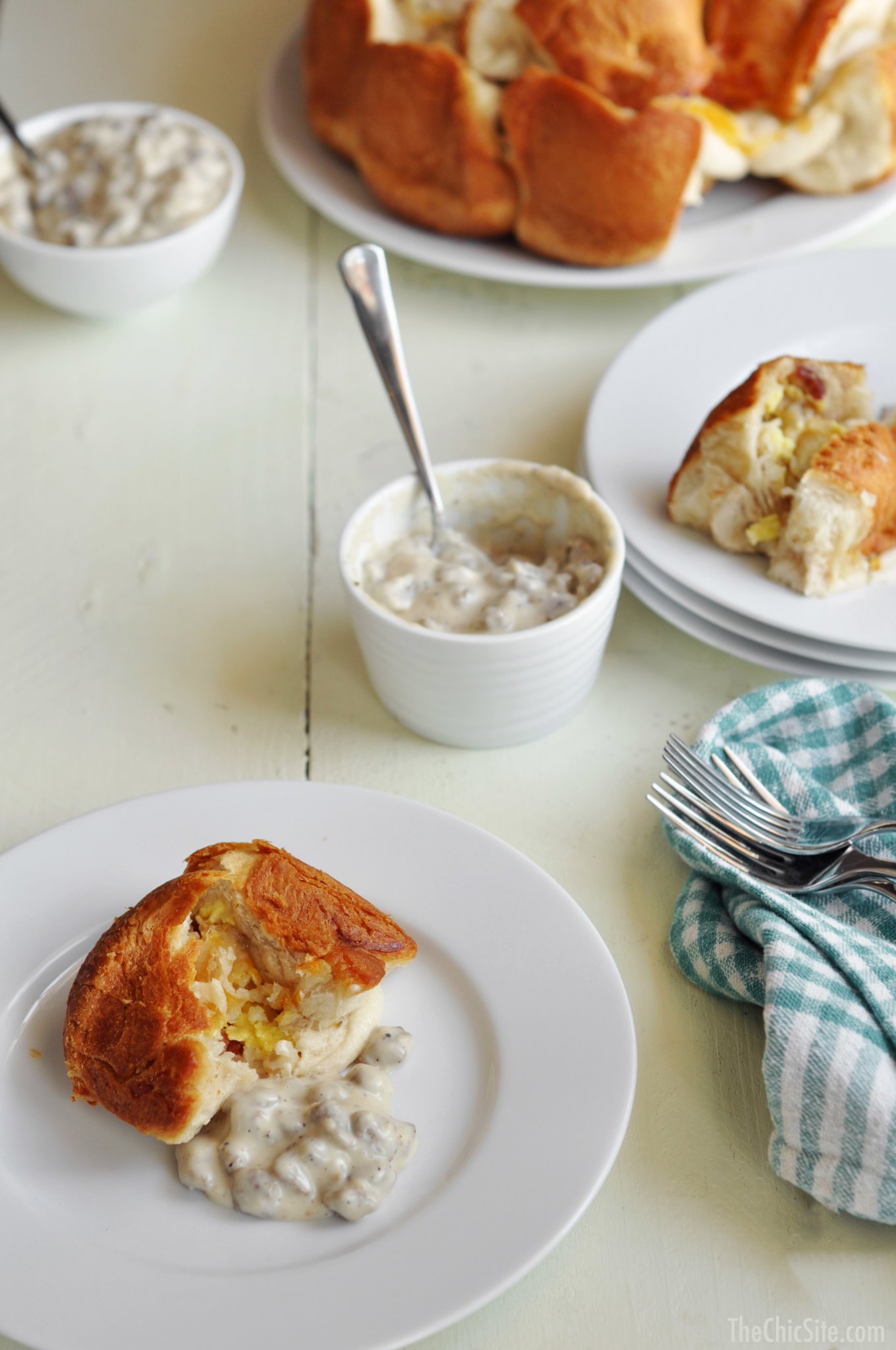 Serve the pull apart bread warm, with the country gravy on the side for dipping. It’s the perfect combination!