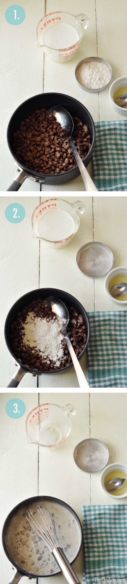 While the monkey bread bakes, make a quick country gravy. In a small pot, melt some butter and heat the turkey sausage. Most stores carry already cooked through, crumbled turkey sausage. That’s what I used. Then add a bit of flour and cook for a few seconds. Whisk in the milk, lower the heat, season with salt and pepper, and cook stirring constantly until the gravy has thickened. If it’s too thick, add a splash more milk.