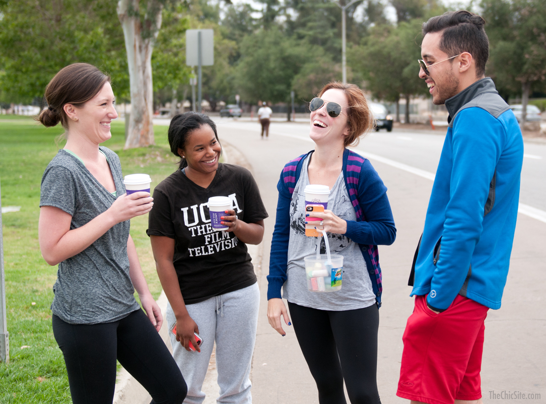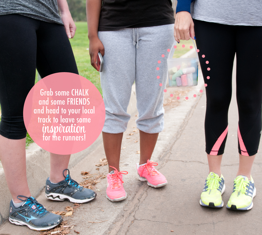 Ok, not real graffiti… just some sidewalk chalk I borrowed from my kids. I thought if I wrote motivational sayings as inspiration for runners on the track near my house then they could see it as they jogged by… and maybe it might help brighten their day, or at least their workout. So, I grabbed the whole Chic team and we went to the Rose Bowl to leave some fun notes for the other exercisers in our hood.