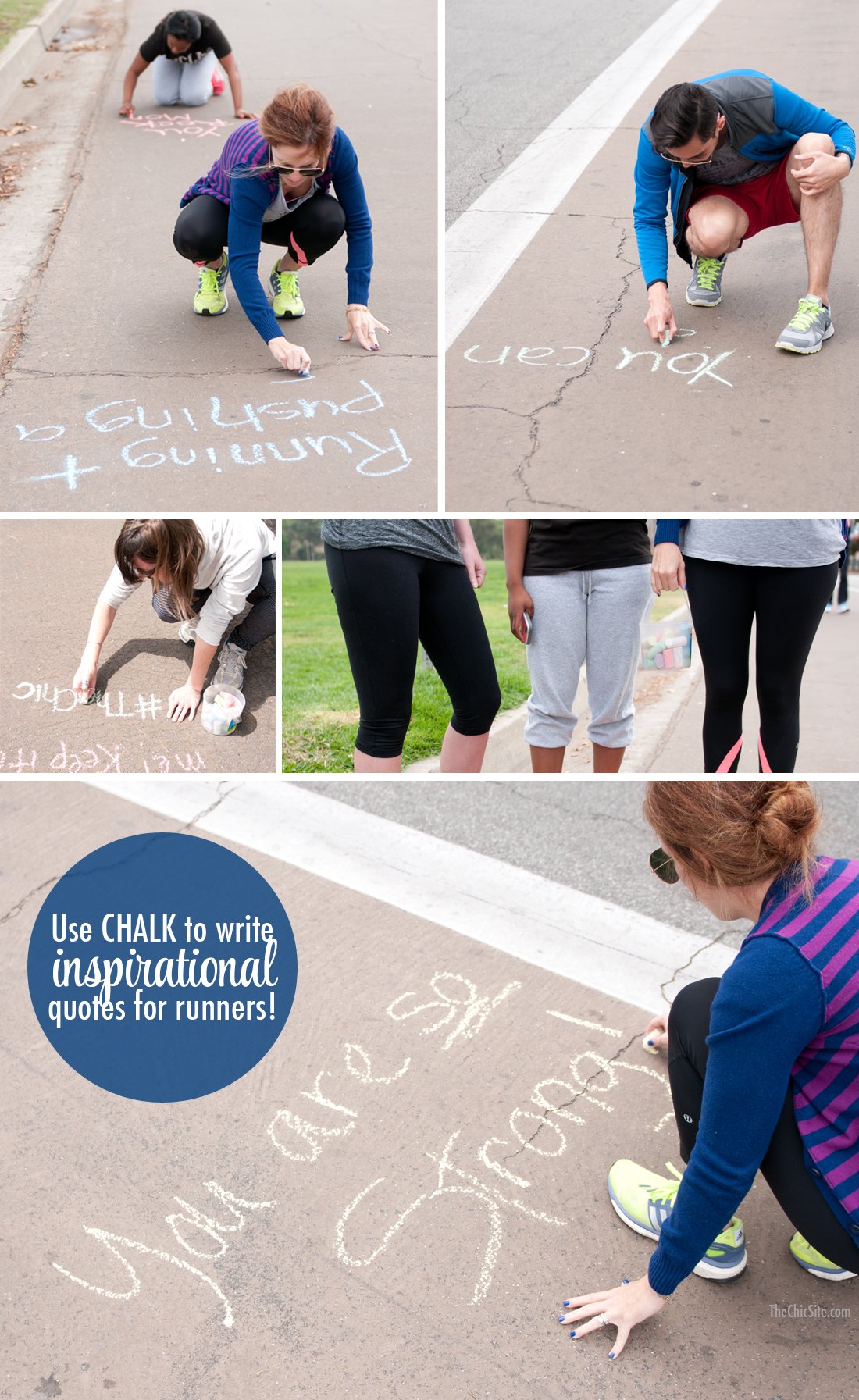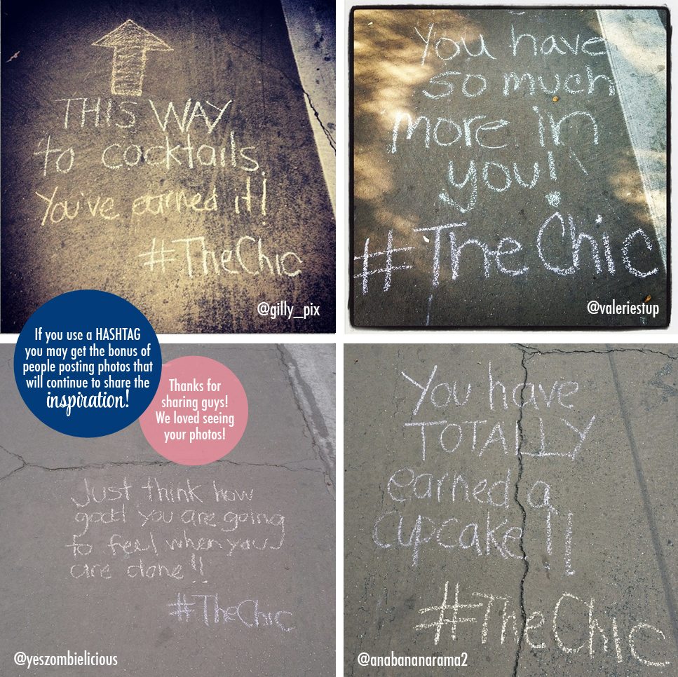 I hope you’ll consider packing some sidewalk chalk in your workout bag and trying this idea out in your own communities. There’s nothing cooler than being inspired when you least expect it, so think up some neat sayings and be sure to tag them #TheChic so we can see them too. Inspiring other women is Chic, pass it on! ~Rachel