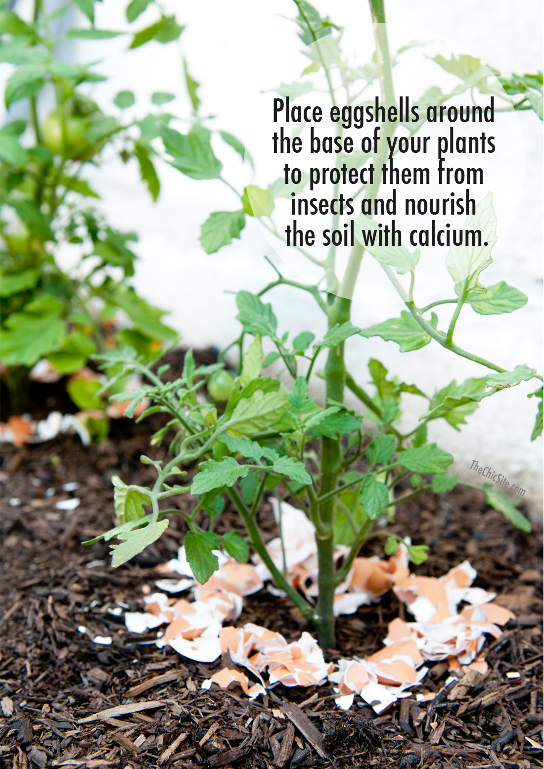 When you put care and love into growing yummy fresh veggies (or any other plants), you want to protect them from pests. There are many chemical ways to do this, but using those sprays can effect the taste and health of the food you are growing. Instead, try using eggshells around the base of your plants. Save your eggshells from breakfast, rinse them throughly, allow them to dry, and then crush them up and place in a circle around the roots. This should discourage small pests and bugs from crawling over onto your vegetables. As a bonus, when the eggshells start to disintegrate and enter the soil they will nourish your plants with calcium like a natural fertilizer. ~Cortnee