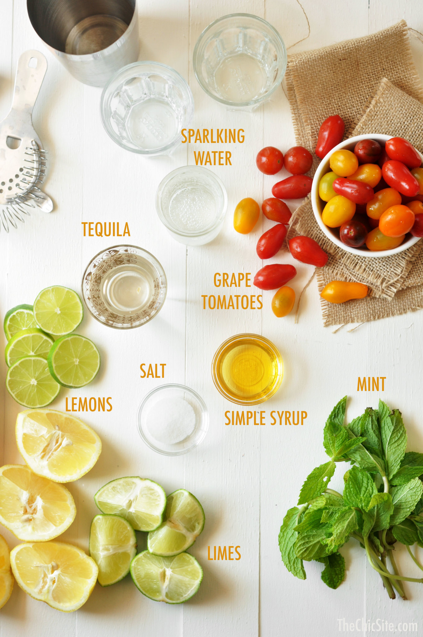 - Pour in the simple syrup (or agave nectar) and tequila. Add ice and shake vigorously. Divide between two short glasses filled with lots of ice. Top off with club soda or sparkling water. Garnish with mint leaves, and a few grape tomatoes on a toothpick. Enjoy!