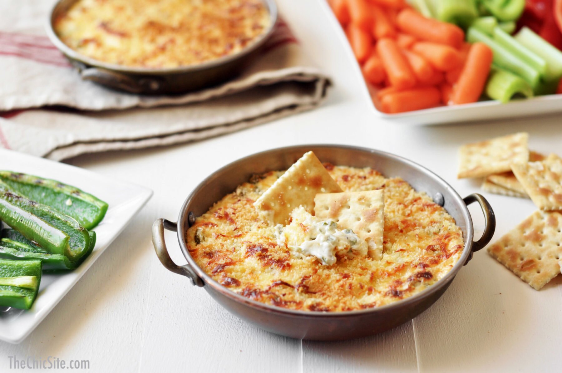 - Pour the dip into an 8 or 9-inch baking dish. Square or round will work. You can also use medium ramekins. Top with the panko bread crumbs and bake for about 20 to 25 minutes, until bubbly and golden brown on top. Serve with veggies, crackers or chips. Enjoy!