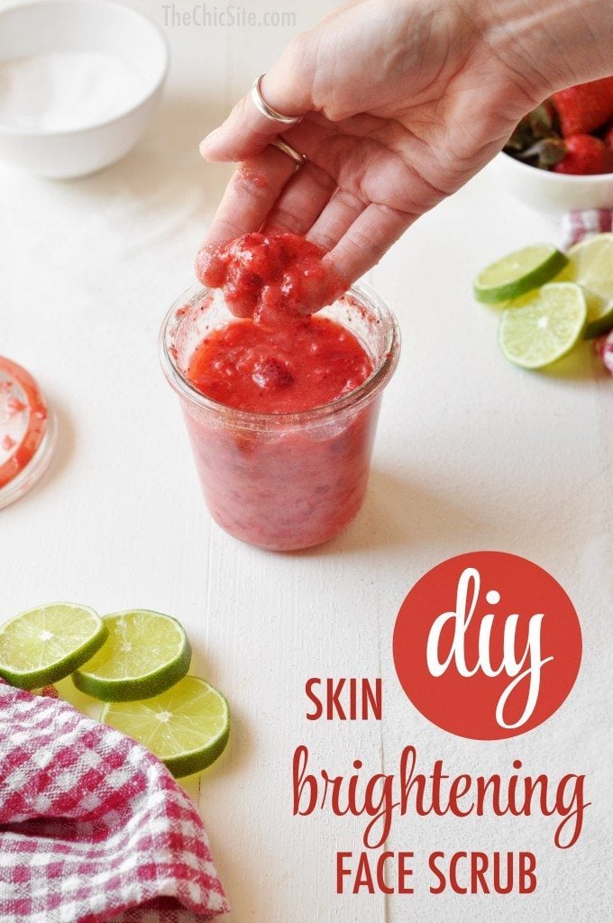 This DIY skin brightening face scrub is chock-full of Vitamin C, antioxidants and natural exfoliators to soften and brighten your skin. The strawberries help improve skin tone and gently cleanse while the salt exfoliates and the almond oil hydrates. Try this scrub if you are in need of a little pick me up. I love the subtle strawberry scent it leaves long after you’ve washed it off! ~Brandee