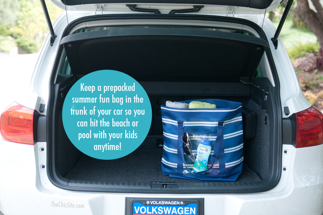 On Saturday I was headed out to a photography class and Dave was gearing up for solo parent duty. In order to occupy our brood while I was out he decided to take them all to the beach. It’s such a fun idea and the boys love to go… it just means that we’ll spend an hour trying to gather the bathing suits, towels, buckets and sunblock. It also means that we inevitably forget something crucial (like a swim diaper!) since I’m running around last minute. In order to solve this problem, I thought it would be fun to show you how to pack your beach bag. That way you can just stick it in the back of your car, then you’re ready to hit the river, lake, beach or pool at a moment’s notice!