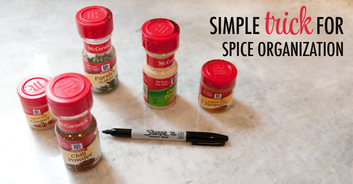 So instead of going crazy on a kitchen pantry redo, I am borrowing one of Rachel’s ideas and going to do one simple thing to make my life easier: organize spices! The thing that I like most about this idea is, it is none of things I mentioned above. It is quick, free, simple and super effective! All you have to do is grab a Sharpie and write the name of each spice on top. That way when you pull the drawer open, you can immediately grab what you need without having to pick up and look through spices, or go out and buy a spice rack or organizer. ~Cortnee