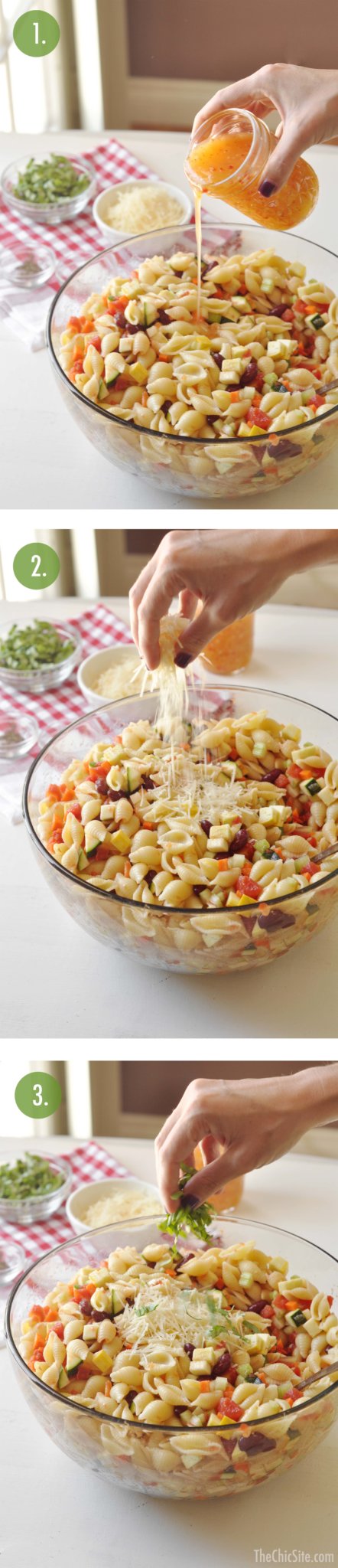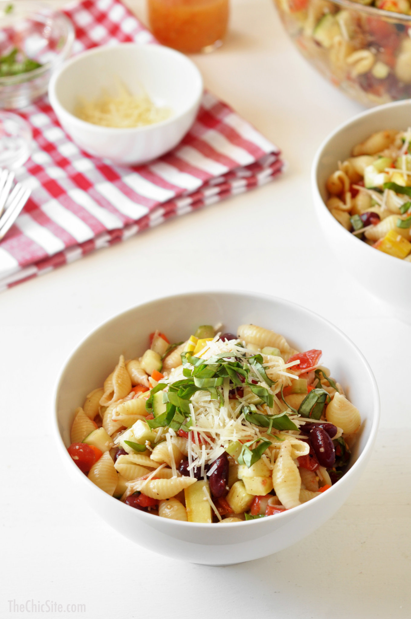 - Add the chopped veggies, drained beans, diced tomatoes, sliced basil and shredded parmesan cheese to the pasta. Toss with the dressing to thoroughly combine. Season to taste with salt and freshly ground black pepper.