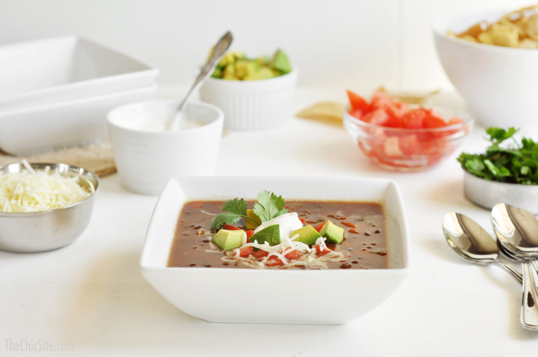 You can serve with an array of different toppings. I recommend dolloping some sour cream, cheese, avocado, tomato and cilantro. Maybe even a couple dashes of hot sauce, if you’re feeling brave. Don’t forget about some tortilla chips for dunking. Enjoy!