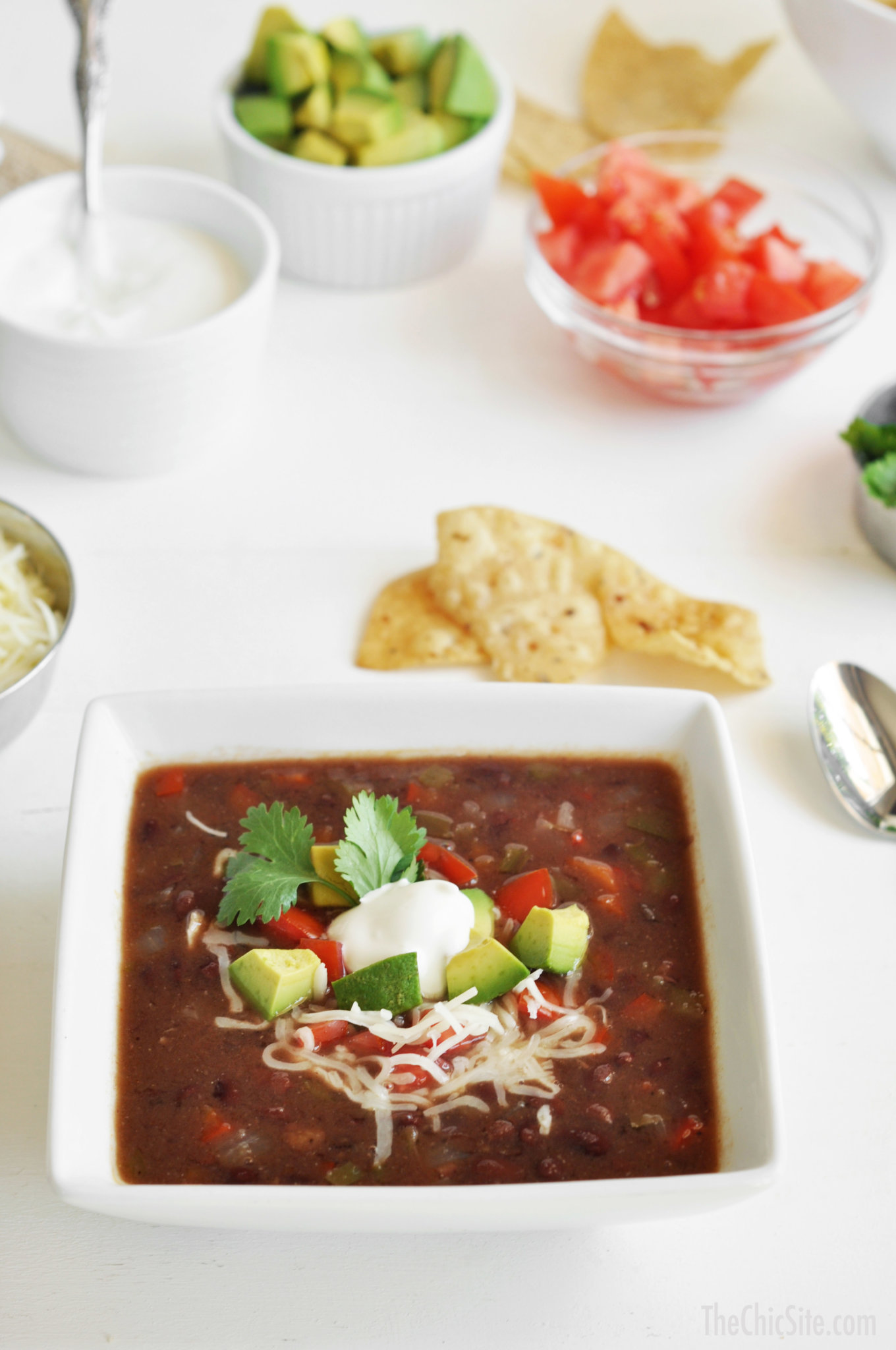- In the bowl of a slow cooker, combine the beans, sautéed veggies, stock, and seasonings. Cover and cook on low for about 6 hours or on high for 3 hours. About an hour before, you can smash some of the beans to help thicken the soup. Serve with any or all of those toppings listed. Enjoy!