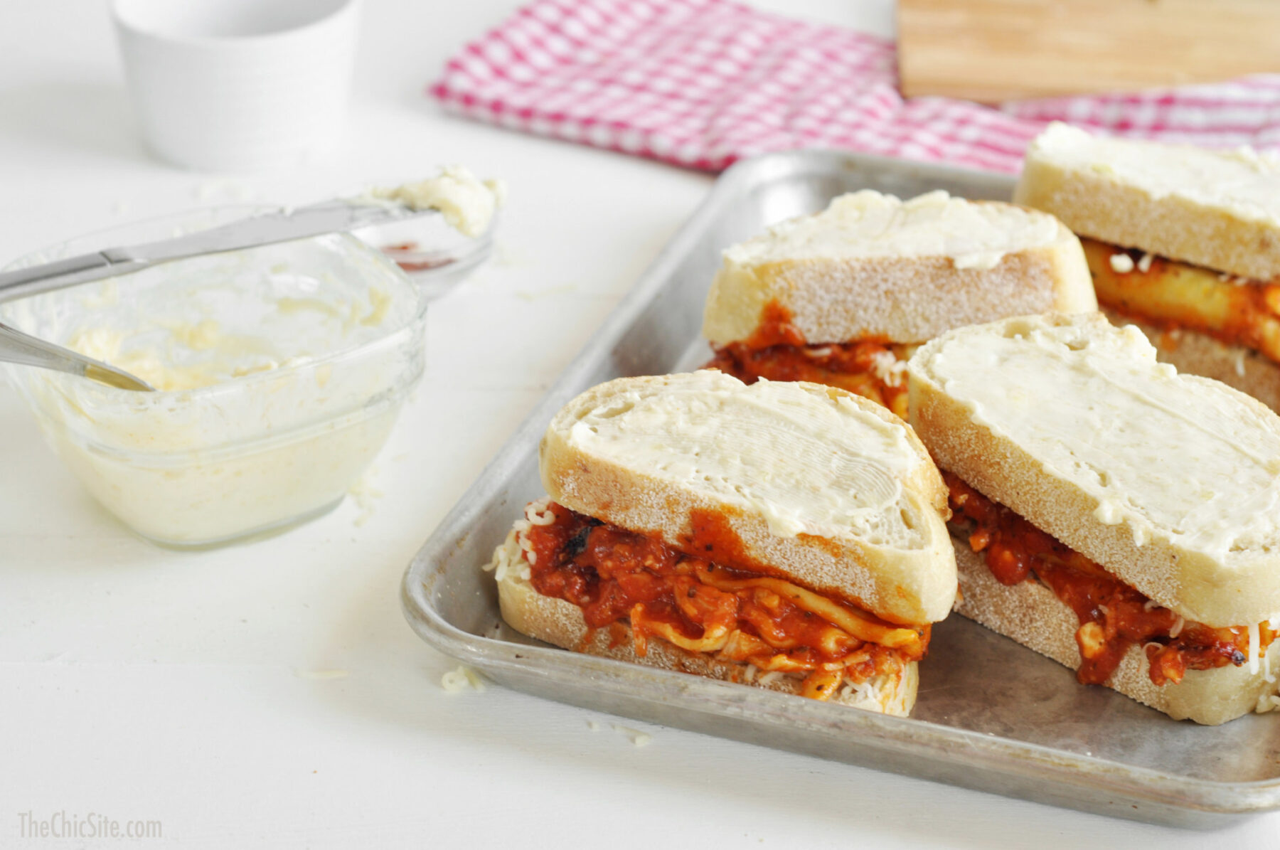 Spread both sides of the grilled cheese with a generous amount of the garlic butter we made earlier. I like to spread the top piece, lay it on the skillet face down and then spread the other side.