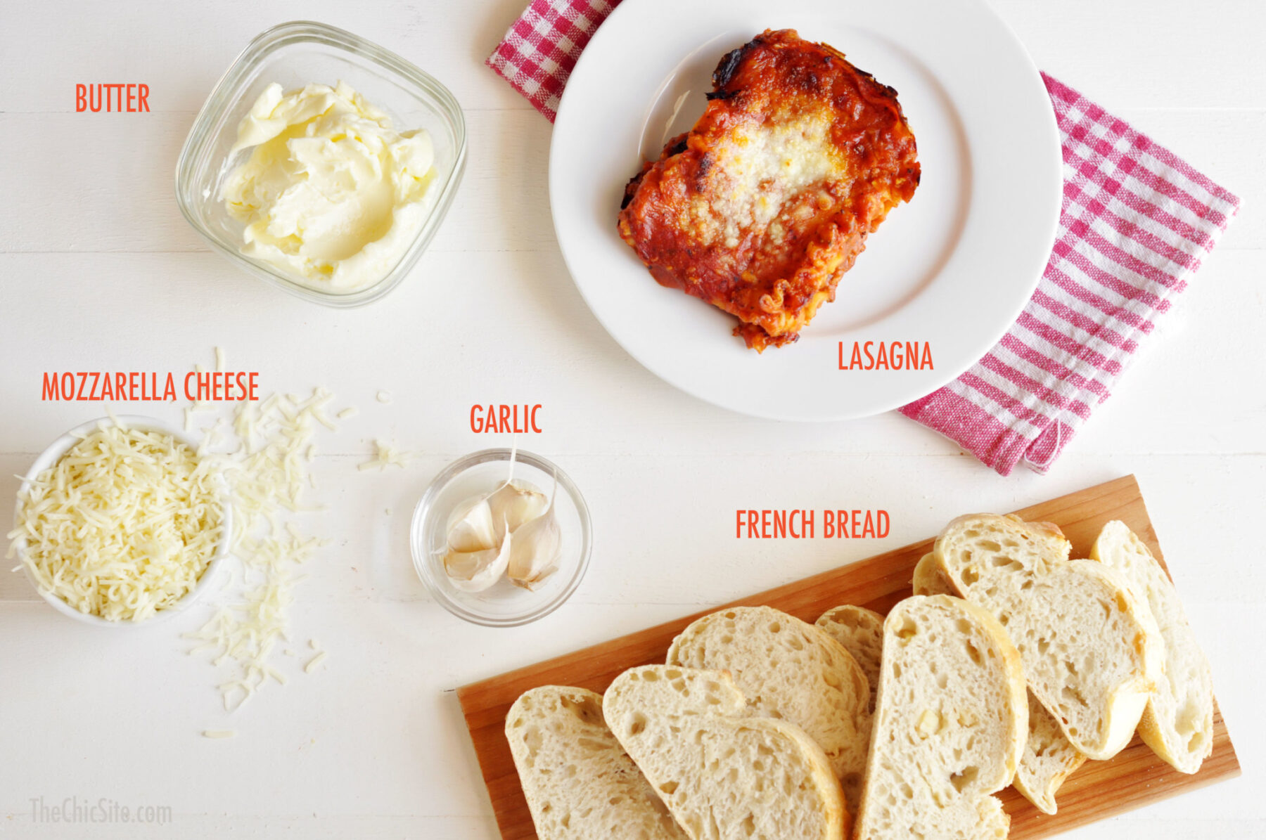 - Sprinkle each slice of bread with cheese. Lay down a slice of lasagna onto half of the slices. Sandwich them together. Spread both sides with a generous amount of garlic butter.