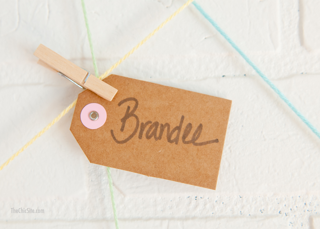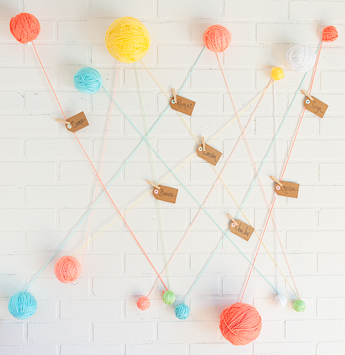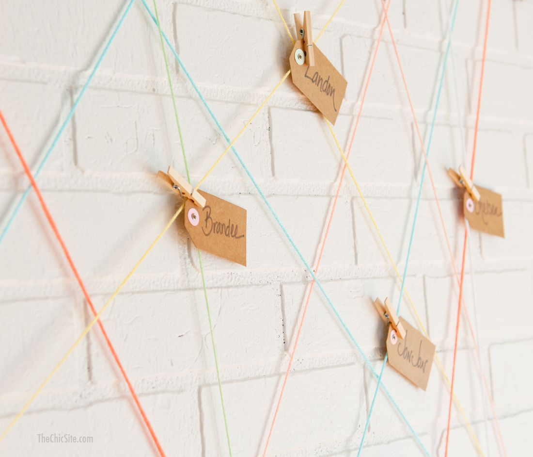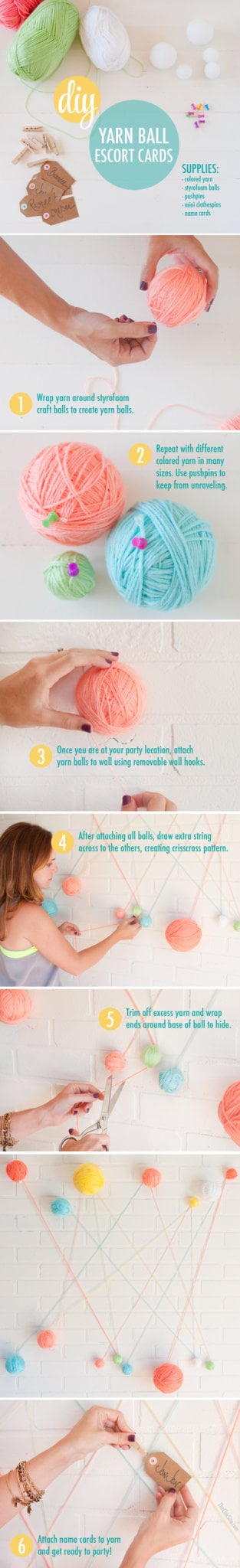 Several months ago I was skimming through a catalogue and I saw that they had attached yarn to the walls. The yarn was so bright and colorful that I thought it would make darling party decor and so I came up with this… attaching your escort cards to a Yarn Ball Display. This would be so sweet at a wedding or a shower, it’s inexpensive and fairly easy to pull off.