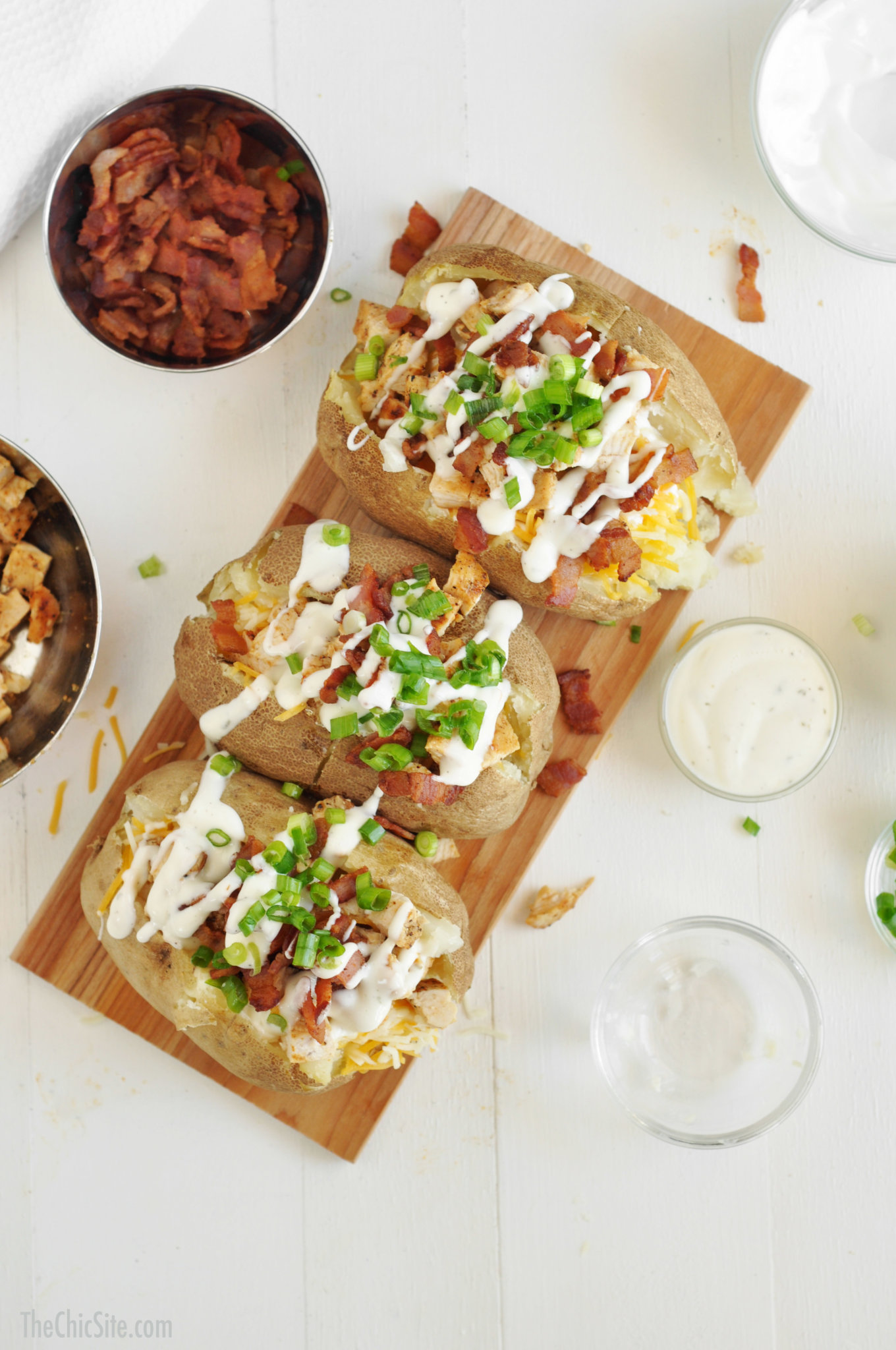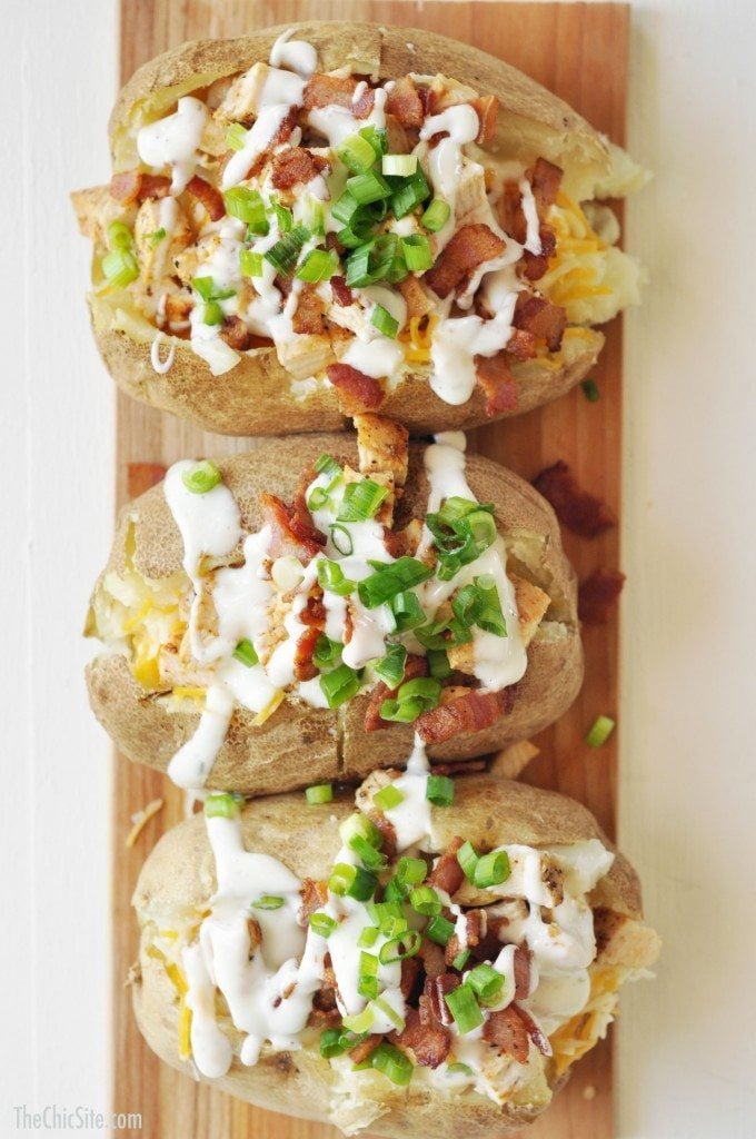 I have three words to share with you guys. CHICKEN. BACON. RANCH. If you’ve never had these three together, combined into one out-of-this-world dish, then you’ve been missing out. Luckily for you, though, here at The Chic Site, we’ve got you covered. These chicken bacon ranch baked potatoes are the perfect summer side dish!