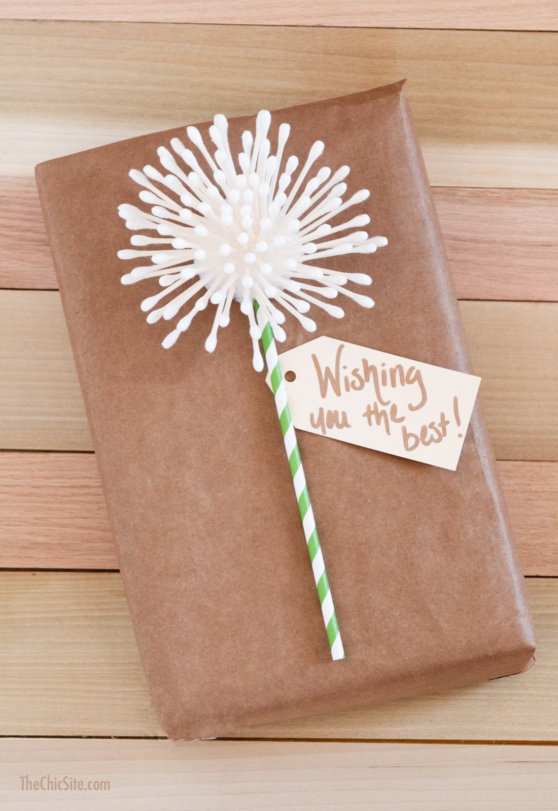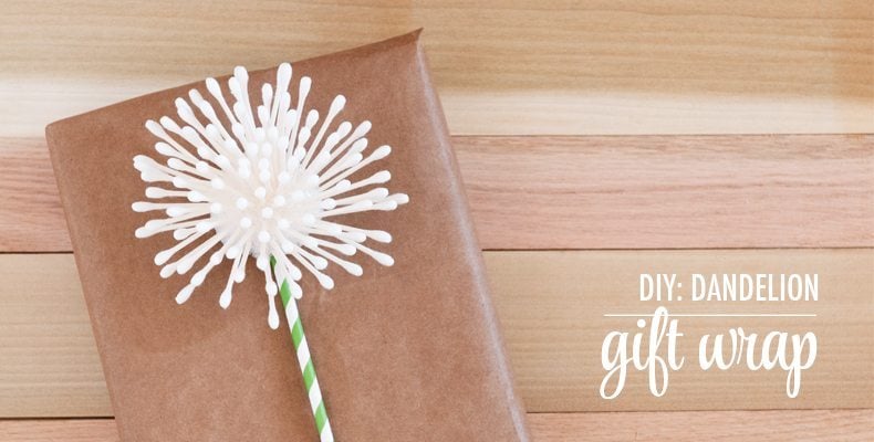I’ve wrapped presents with vintage maps and even a kitchen towel, and I’m always looking for new and different ideas. When I saw someone make a flower with q-tips (they painted the ends) I thought, wait a minute, let’s just leave them white and make some DIY Dandelion Gift Wrap! And well, readers, here we are.