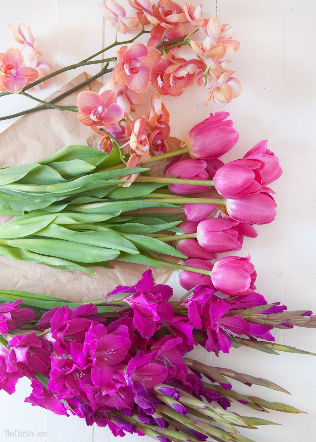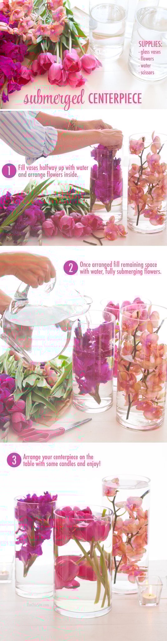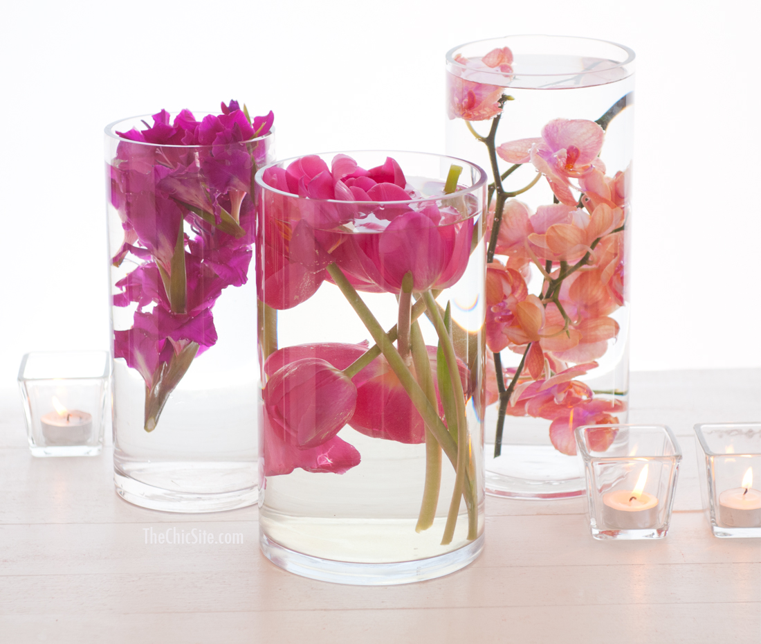 Back in the day, when I was a wedding planner there was a summer when nearly every single bride brought me the same photo as centerpiece inspiration. In it were three cylinder vases with flowers submerged under water. It was a tad modern but the cherry blossoms in the shot made it feel sweet and perfect for a wedding. I thought it would be fun to recreate this submerged flower centerpiece for you readers because the whole put it under water thing means that you don’t need any actual skill to pull this off! Try it for your next party or just as a fun way to pretty up your coffee table! ~Rachel