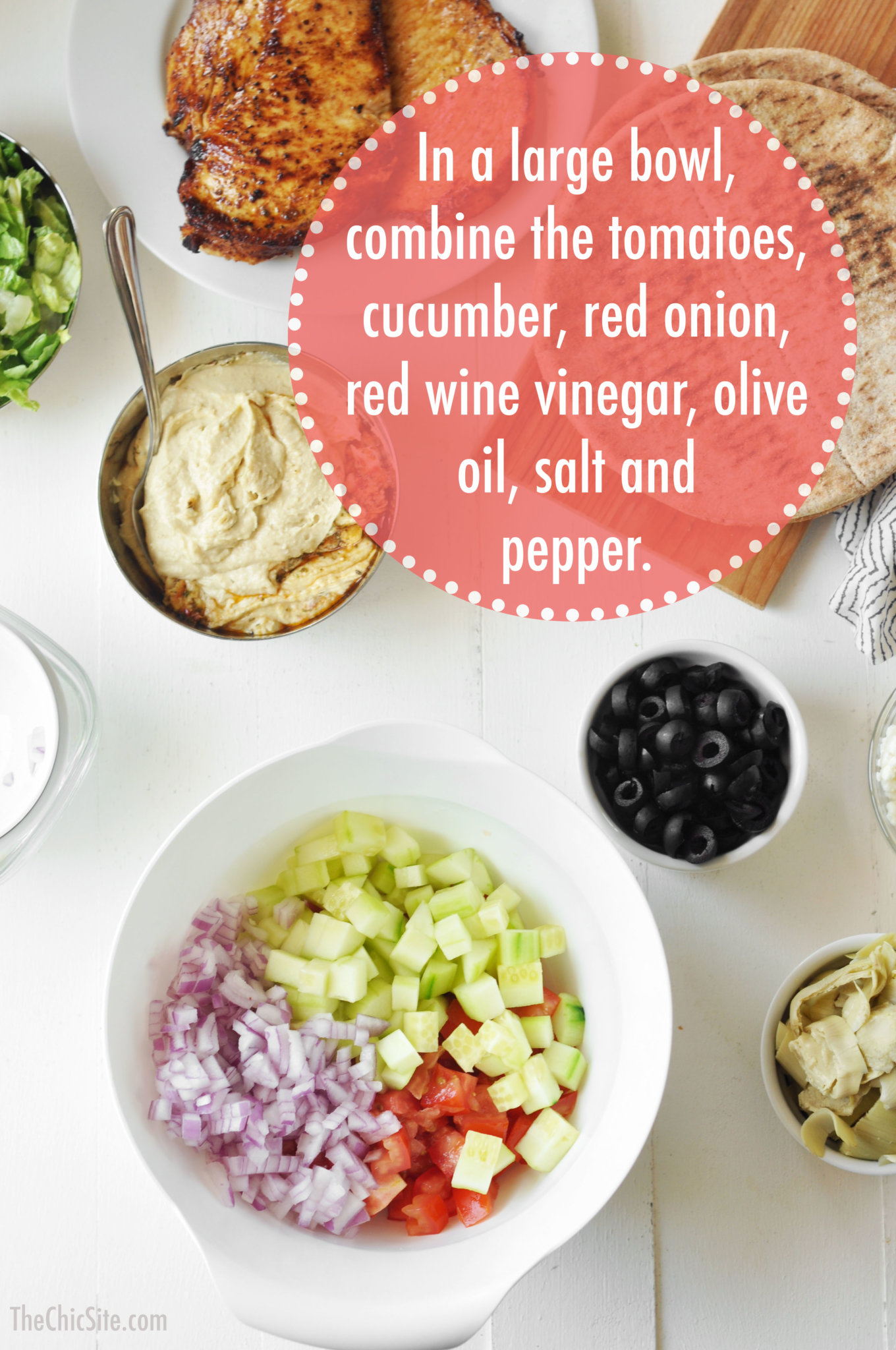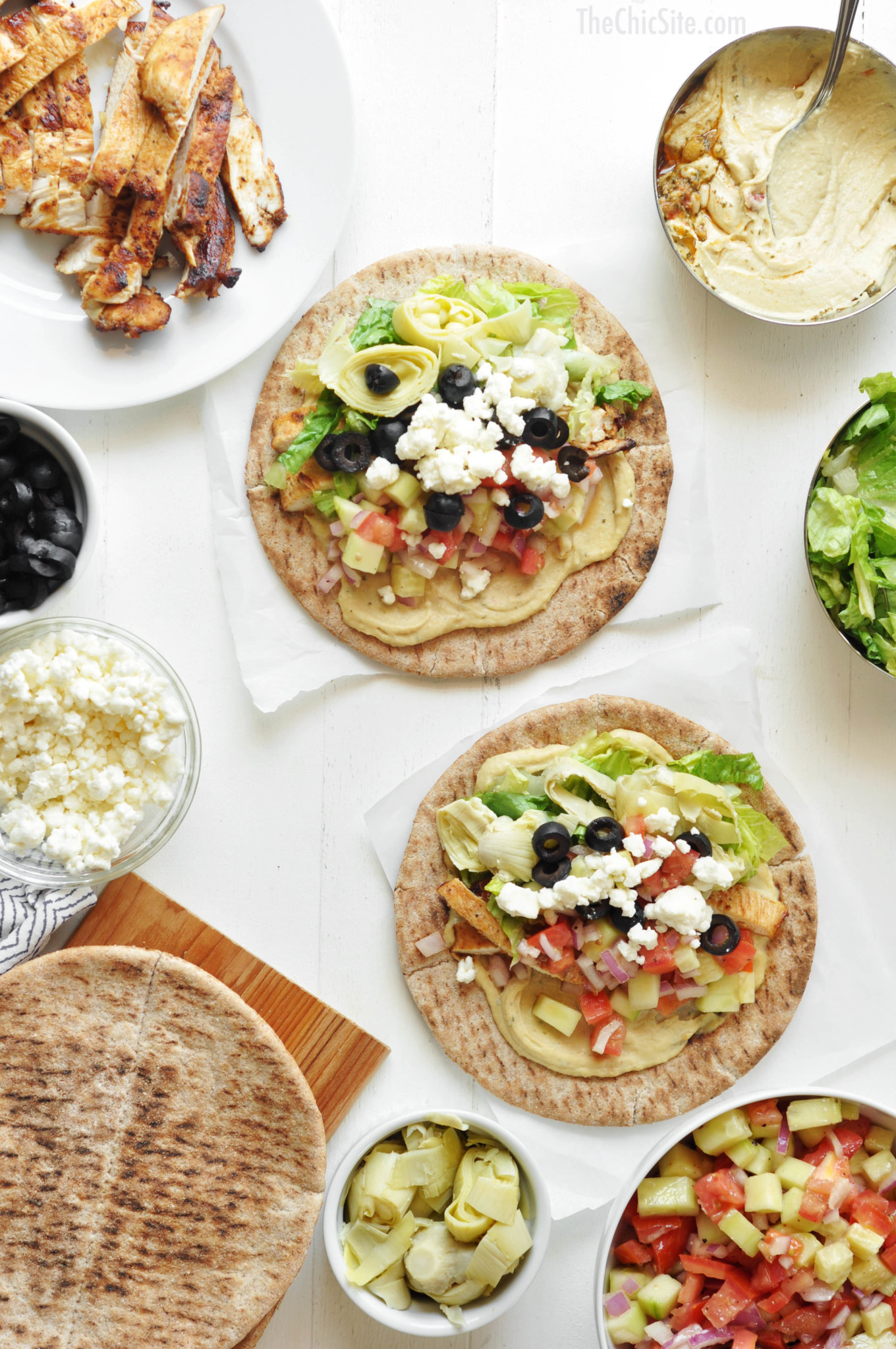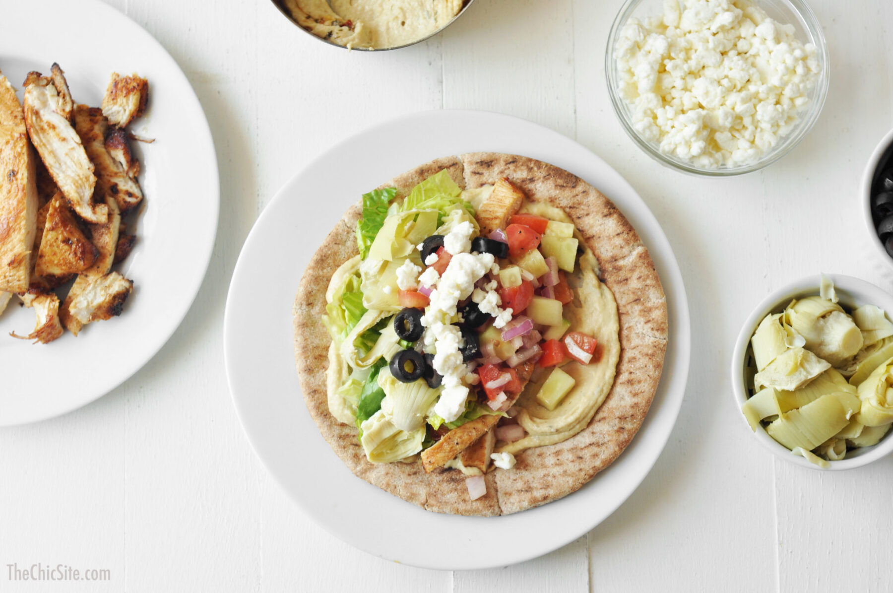 - Warm the pita bread in the oven or on the stove top. Spread a good amount of hummus on the bottom of each pita bread. Top with the chicken, lettuce, artichoke hearts, tomato/cucumber salad, olives and feta cheese. Fold up like a taco and enjoy!
