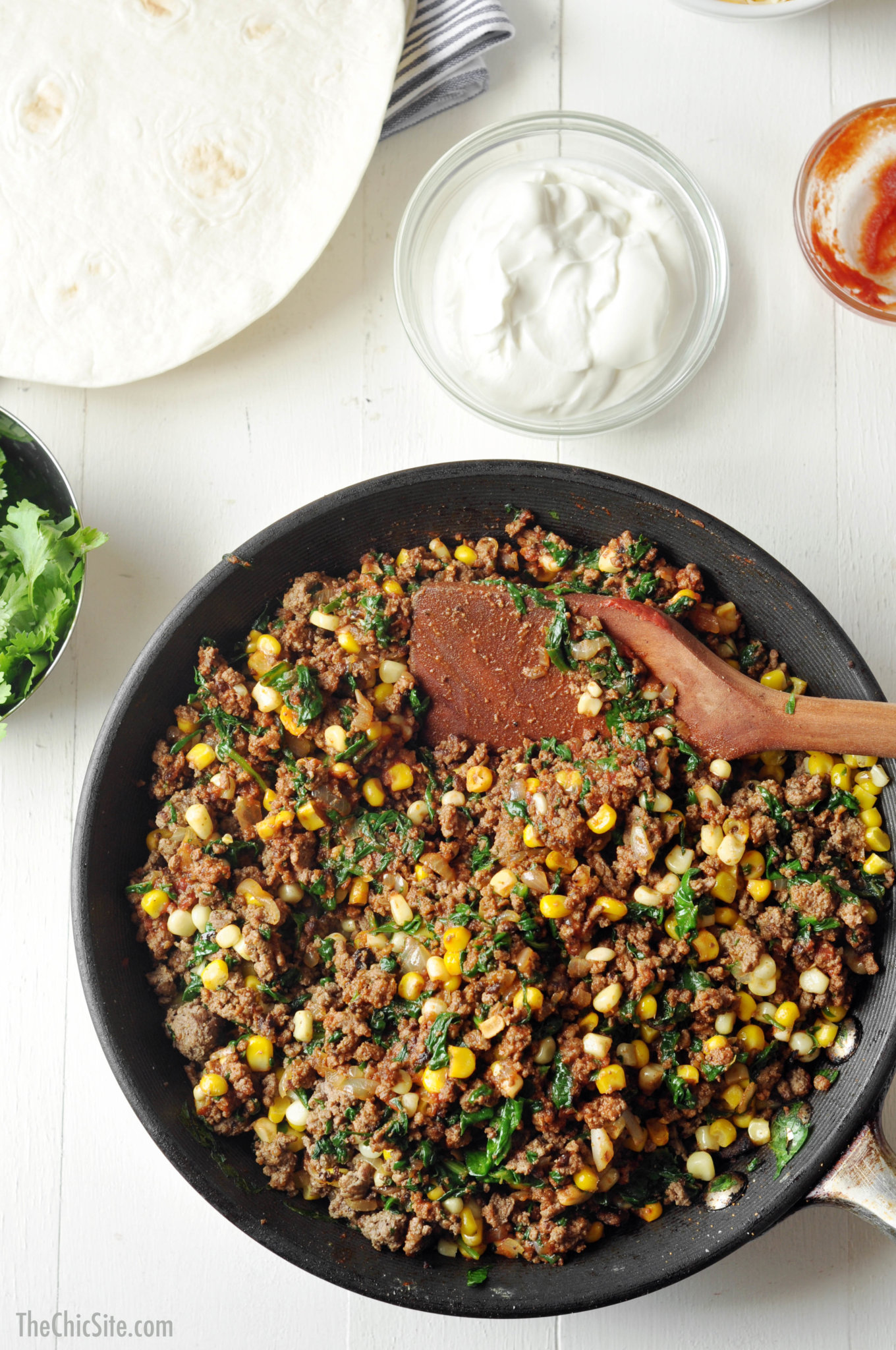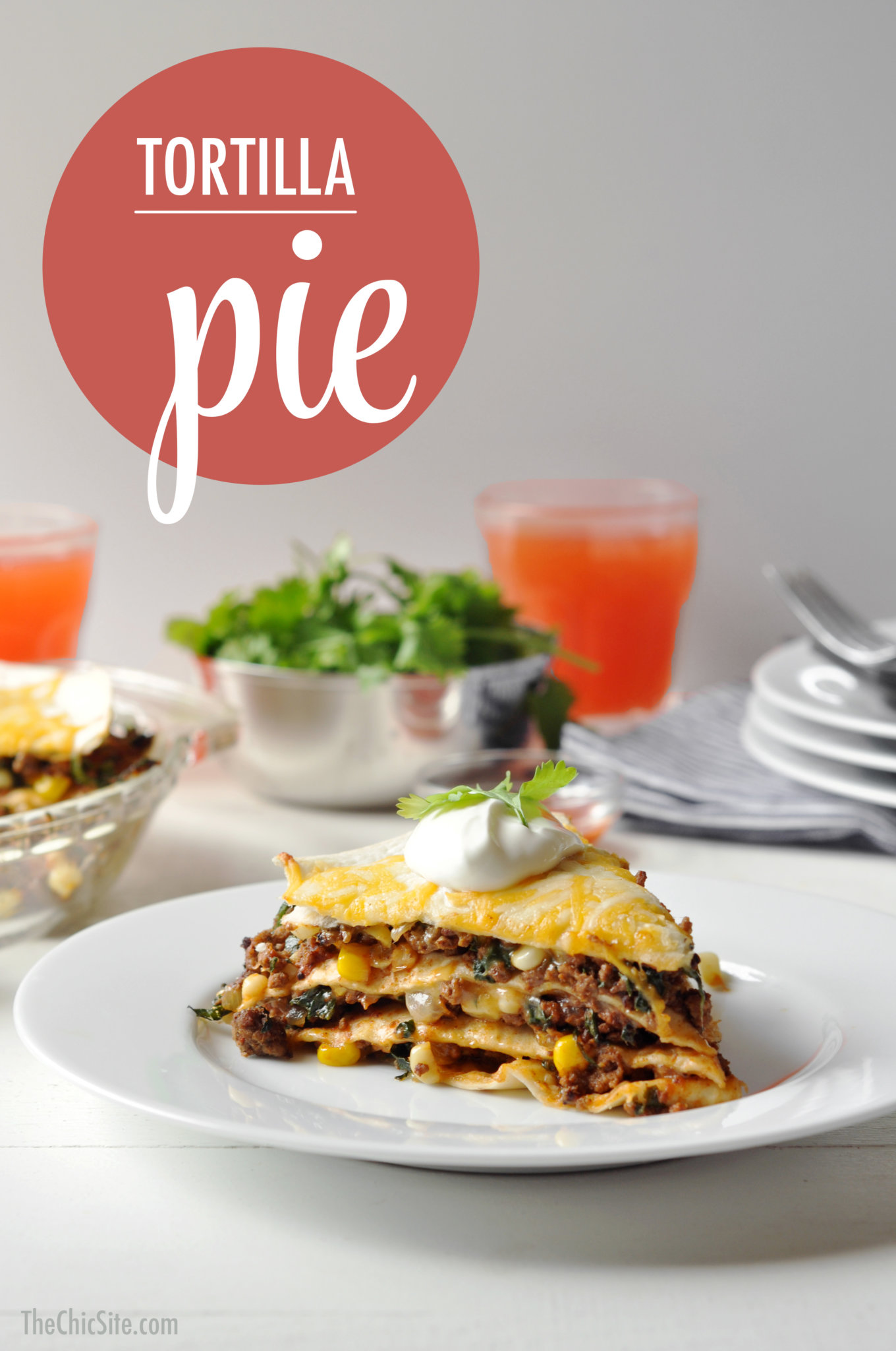 Rachel has had this idea for Tortilla Pie for a while now and I’ve finally had the opportunity to make it here at The Chic HQ. It’s easy to make and super delicious. Flour tortillas layered with seasoned ground sirloin, corn, spinach, and of course cheese! The perfect weeknight dinner.