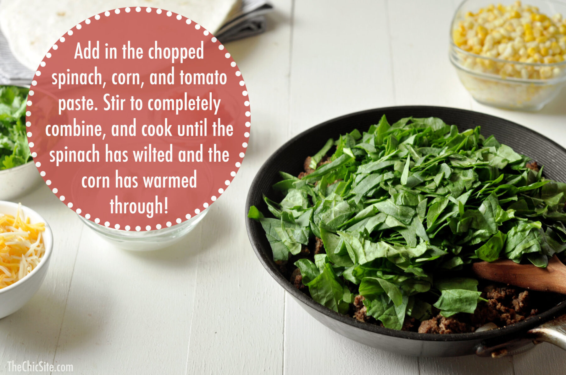 - Heat a large skillet over medium-high heat. Add the oil and cook the ground beef until browned. Add the chopped onion, garlic and seasonings and cook for about 5 minutes or until they have softened. Add in the chopped spinach and corn and cook until the spinach has wilted. Stir in the tomato paste. Cook for 1 to 2 minutes longer. Remove from heat.