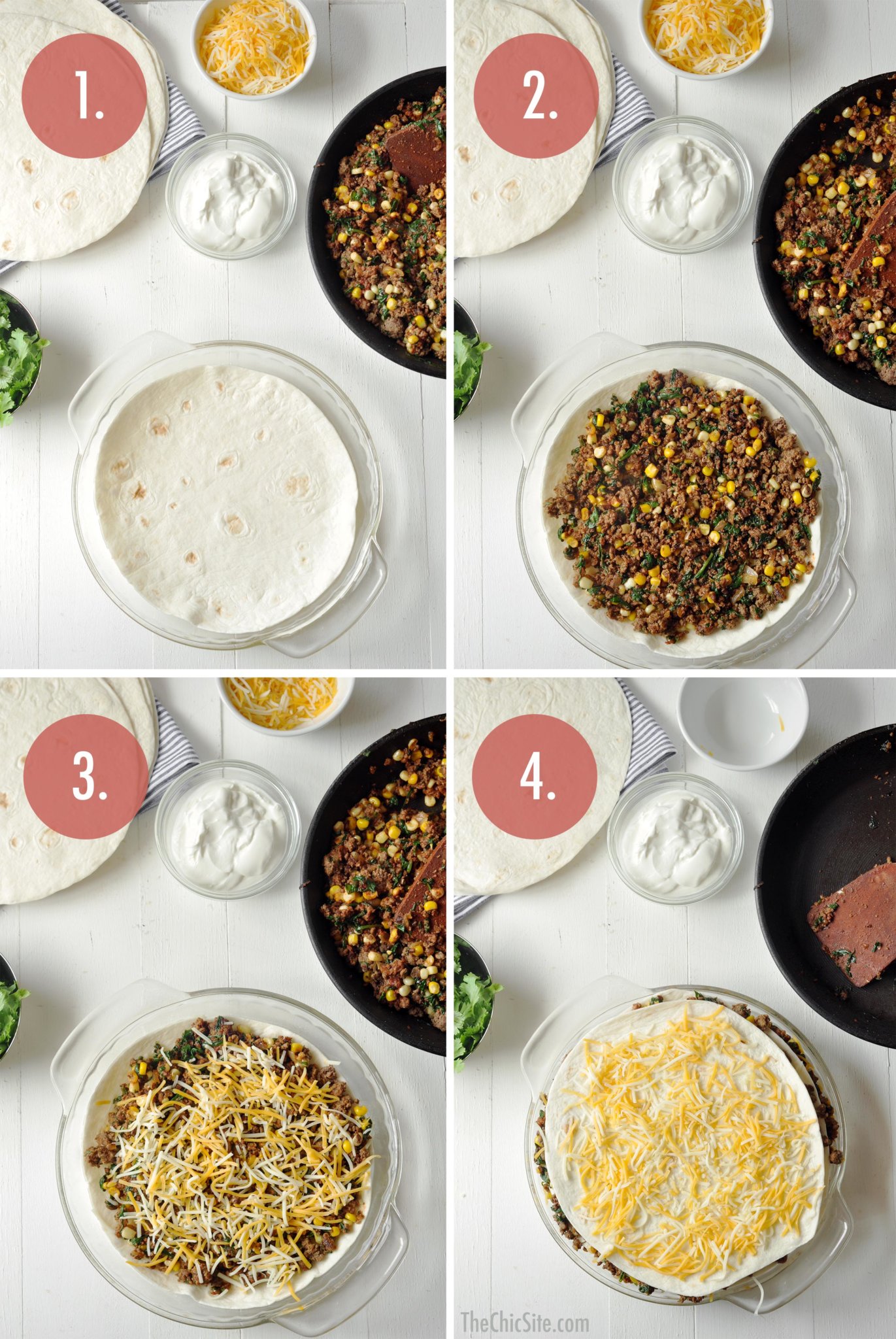 - Place one flour tortilla in the prepared dish. Spoon some of the ground beef mixture, spreading it out evenly. Top with cheese, and repeat with another flour tortilla, more ground beef and cheese. Continue in this manner with the remaining two layers. Finish with a flour tortilla on top and a sprinkling of cheese.