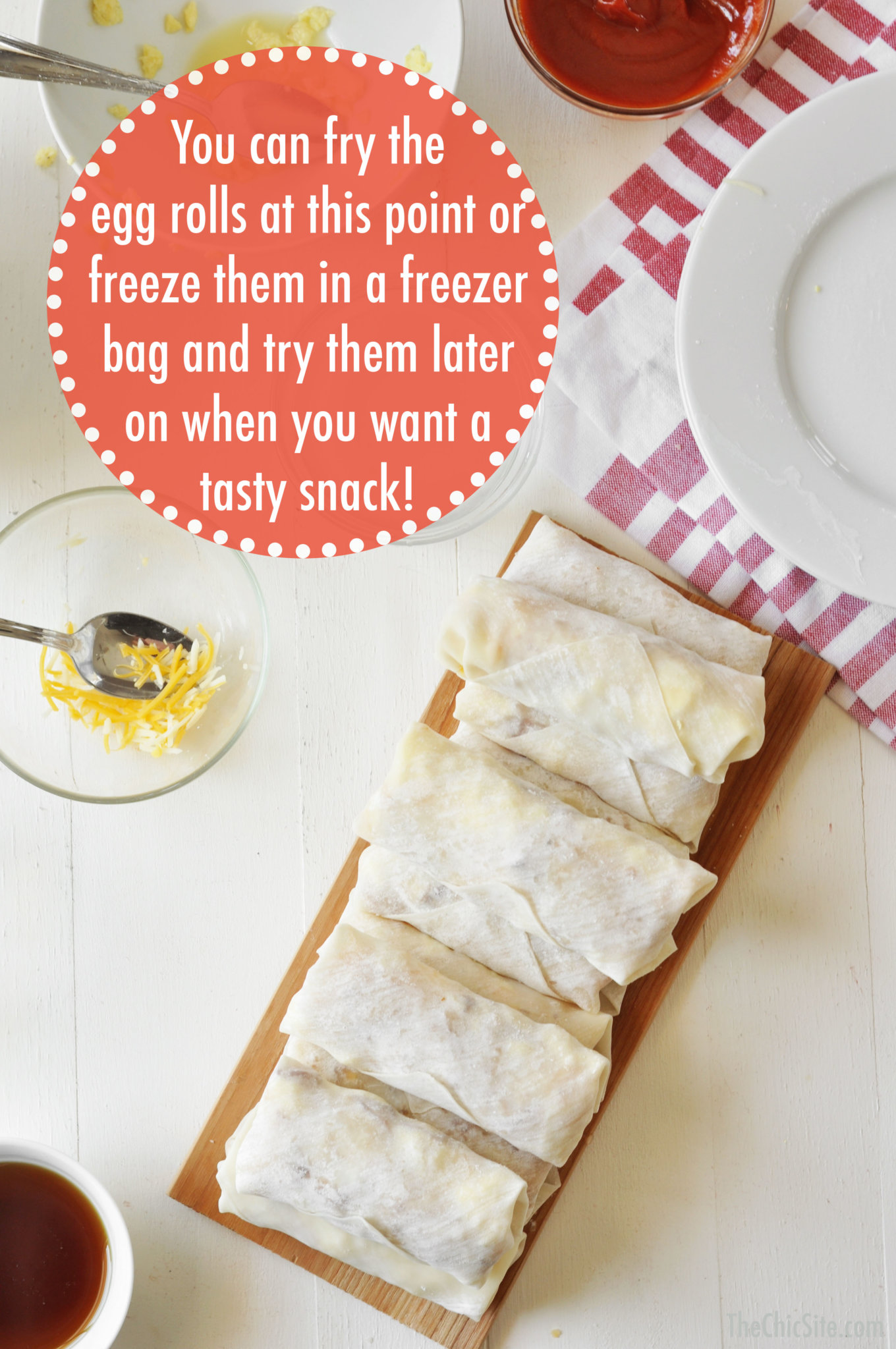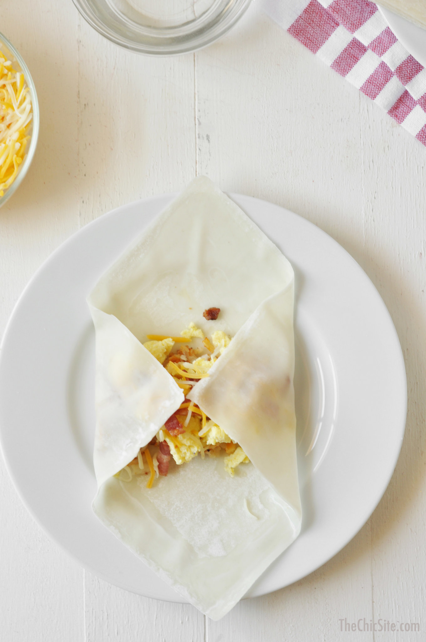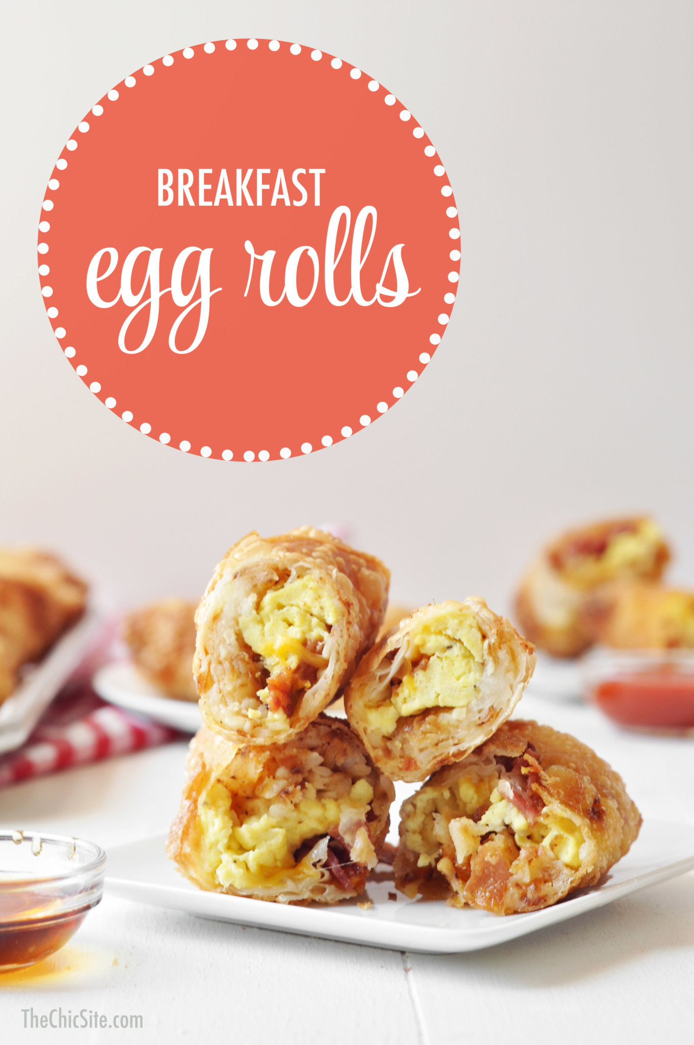 We’re really reinventing breakfast over here at The Chic. We wanted to bring you a delicious breakfast on the go! These Breakfast Egg Rolls are filled with scrambled eggs, hash browns, cheese, and crispy bacon, but feel free to switch things up and fill them with your favorite breakfast items!