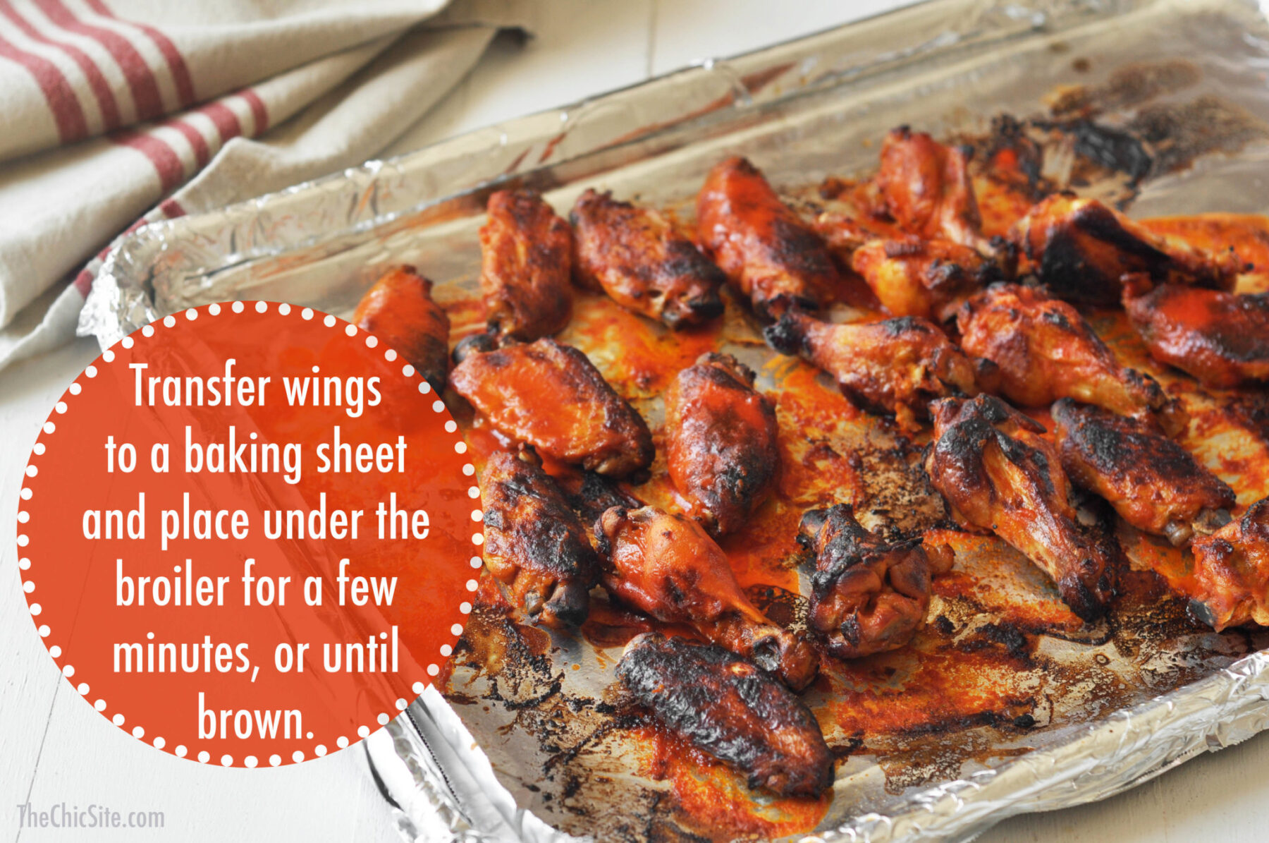 - Once the wings are done, transfer them to a baking sheet, lined with foil. Brush them with more hot sauce on both sides and place under the broiler. Broil for a few minutes on each side, to crispy them up and char them. Serve with ranch or blue cheese dressing and celery sticks. Enjoy!