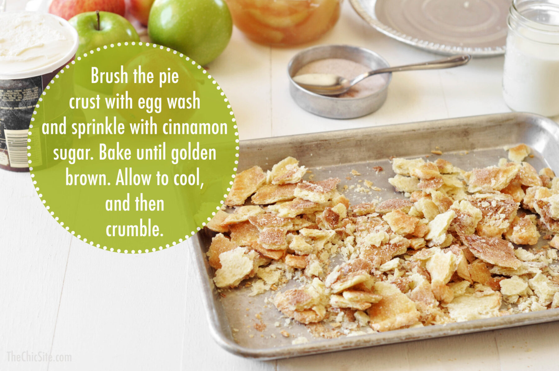 - Preheat oven to 350 degrees F. Line a baking sheet with parchment paper, and place thawed pie crust directly on baking sheet. Brush the top with egg wash and sprinkle liberally with cinnamon sugar (sugar and cinnamon mixed together). Bake for about 15 to 20 minutes or until golden brown. Allow to cool, and then crumble with your hands.