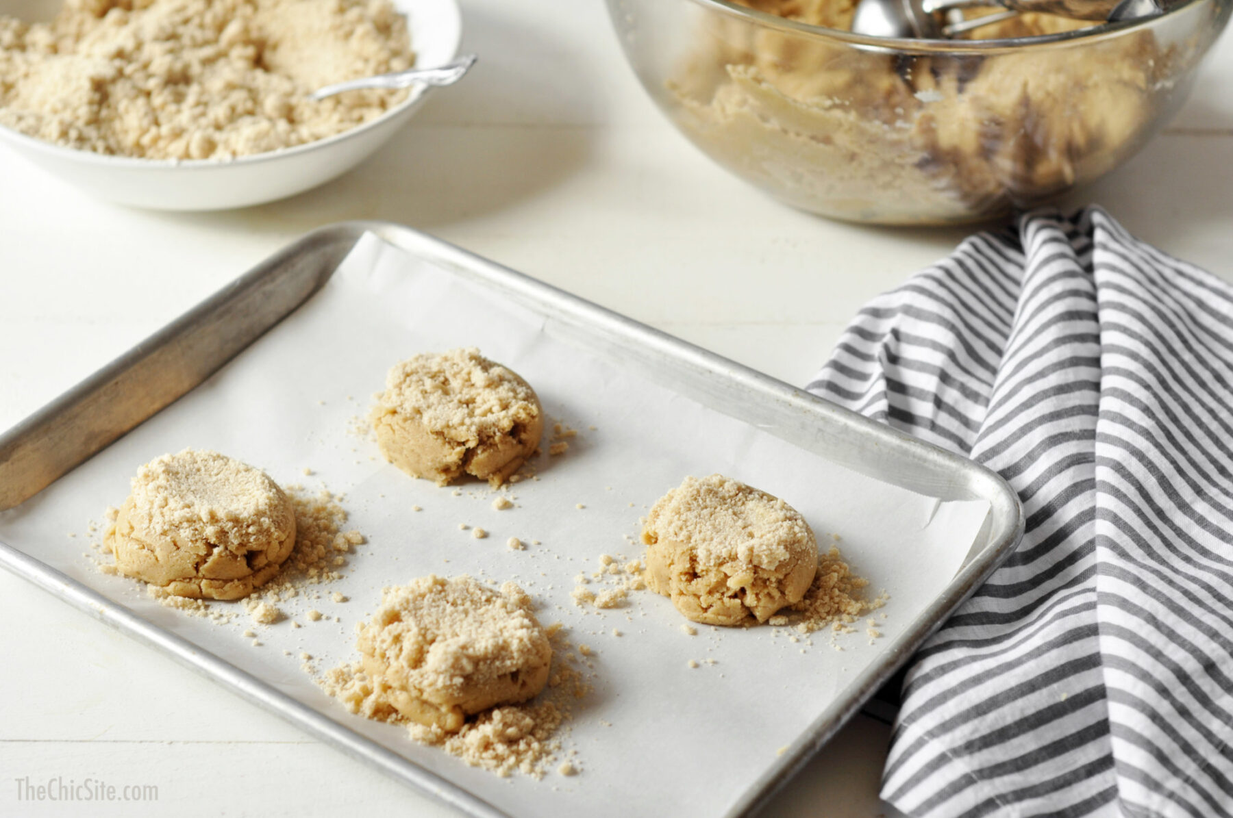 - Using a medium ice cream scoop, portion out large rounds of cookie dough onto the prepared baking sheets, make sure to leave enough space in between. Make an indentation in the center of each cookie and sprinkle a rounded spoonful of the crumb topping. Bake for about 10 to 12 minutes or until golden brown around the edges. Remove from oven and allow to cool slightly on baking sheets. Transfer to wire racks and allow to cool down completely.