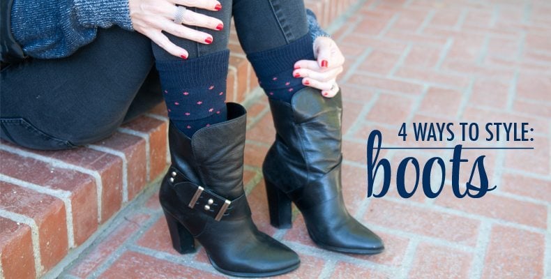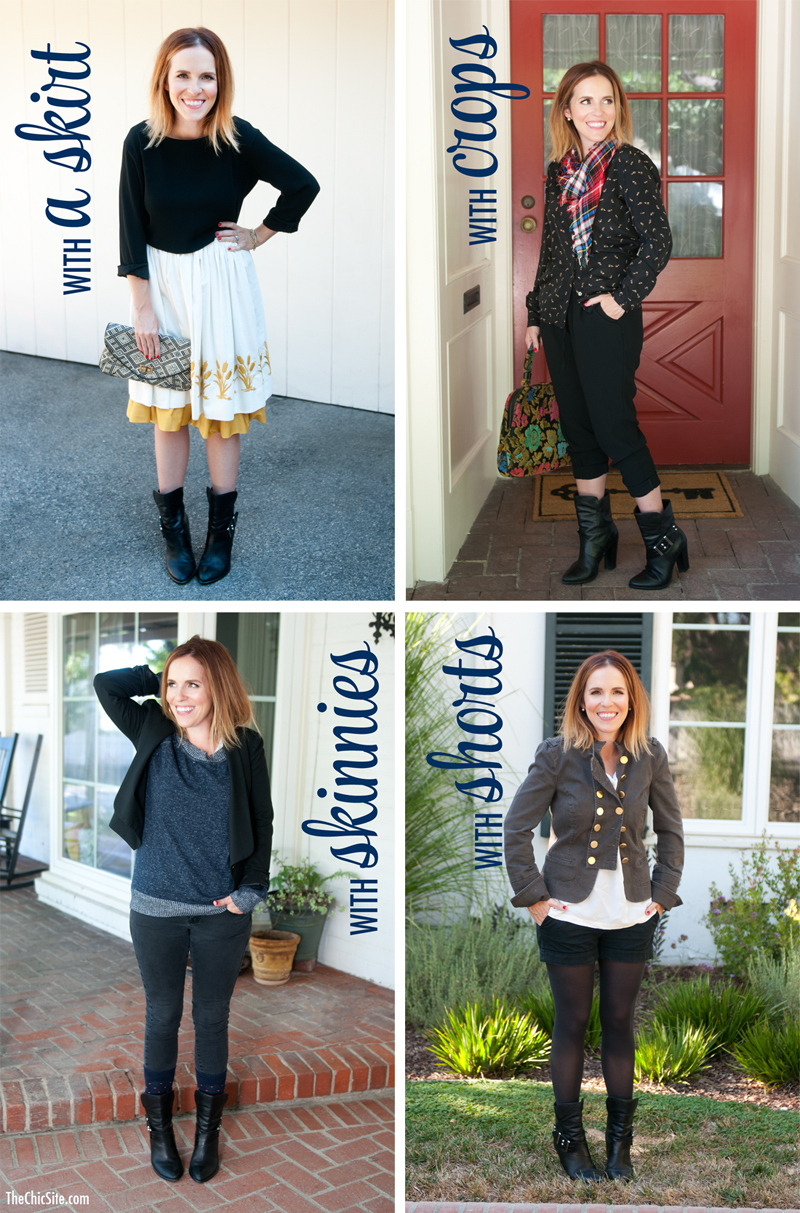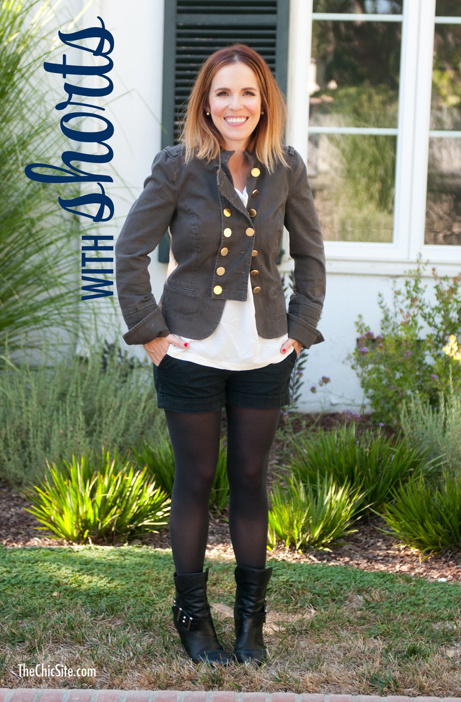 In the summer I style booties with shorts, in the fall and winter I throw on a pair of tights and continue the trend. This look is fun because you can dress it up or down, add socks like the last look if it’s a particularly chilly day.
