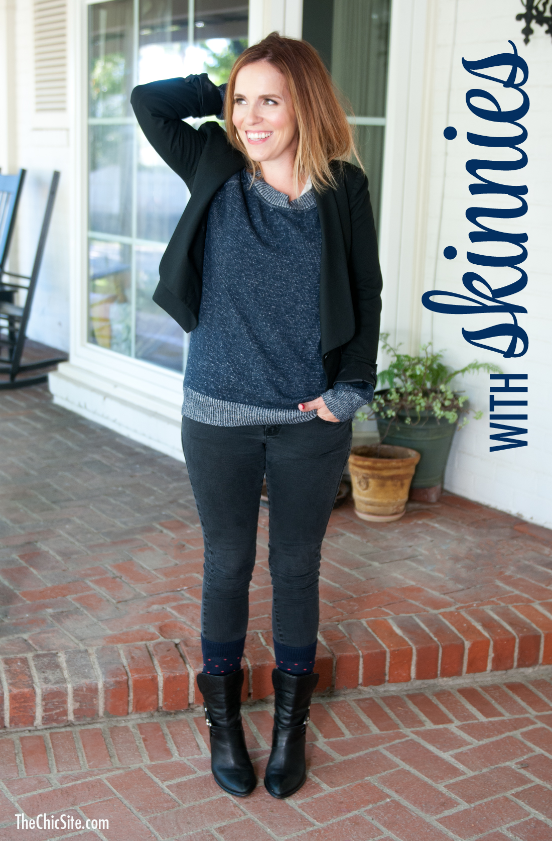 Style booties with skinnies AND socks… almost everyone wears boots with skinnies but I love adding the extra layer of a fun print sock peeking out above. I saw this in Europe ten years ago and I’ve been trying to emulate the style ever since. Notice I didn’t go for a crazy bright sock that catches the eye, just something playful to add to the over all layered look.